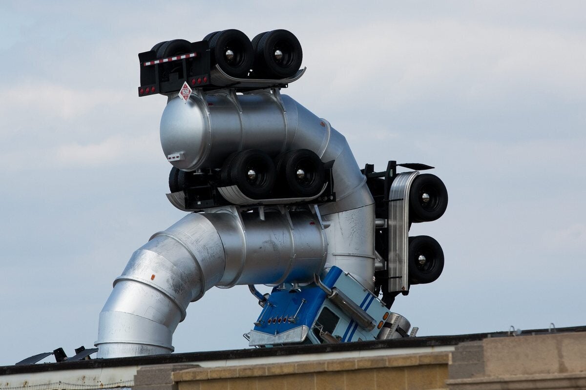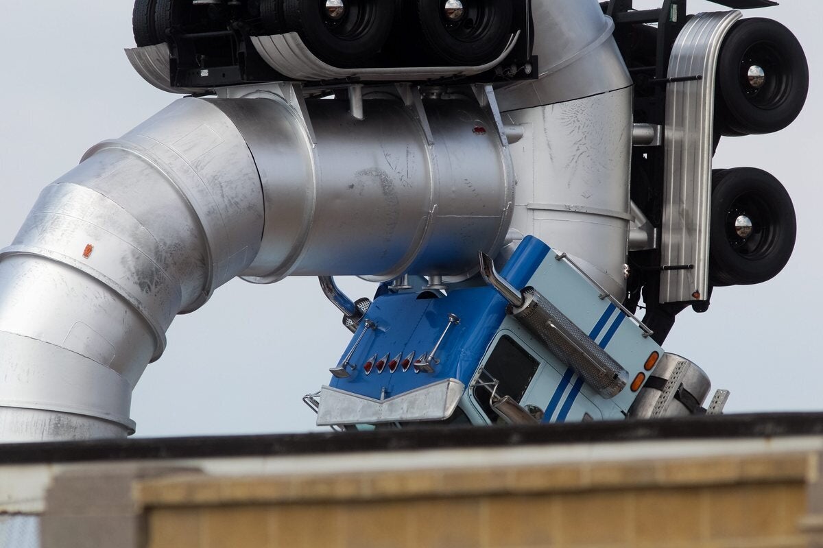 Μέσα στο νερό υπάρχει ένα ημιβυθισμένο φορτηγάκι της αστυνομίας που λειτουργεί ως συντριβάνι.