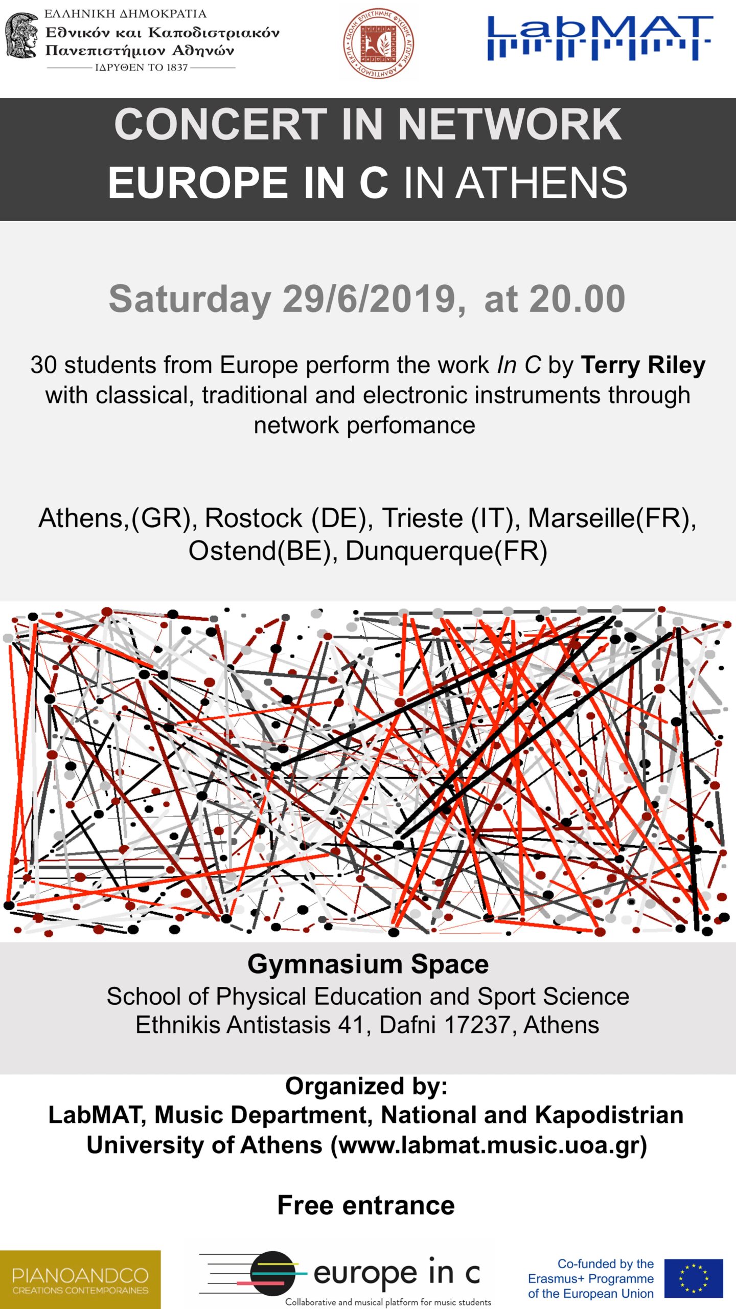 Ο Terry Riley είναι ο πλέον «εγκεφαλικός» αλλά και φιλοσοφημένος της μεγάλης τριάδας των Αμερικανών μινιμαλιστών σε σχέση με τον περισσότερο «ακαδημαϊκό» πλουραλισμό του Steve Reich και τον υποδειγματικό φορμαλισμό του Philip Glass. Γραμμένο το 1974 το «In C» είναι από τα πλέον ενδεικτικά έργα του με κύριο χαρακτηριστικό του το ότι δεν ορίζεται ο αριθμός των εκτελεστών, γεγονός που προφανώς καθιστά κάθε εκτέλεση του περισσότερο ή λιγότερο δραστικά διαφορετική από όλες τις υπόλοιπες. Δεν είναι παράξενο λοιπόν ότι έδωσε τον τίτλο στο Ευρωπαϊκό Πρόγραμμα Erasmus+ «Europe in C» στο πλαίσιο του οποίου θα πραγματοποιηθεί η συναυλία που την συνολική ευθύνη και τον συντονισμό της έχουν η καθηγήτρια μουσικής τεχνολογίας Αναστασία Γεωργάκη και ο επιστημονικός συνεργάτης του ΤΜΣ του ΕΚΠΑ Κώστας Κατσαντώνης.