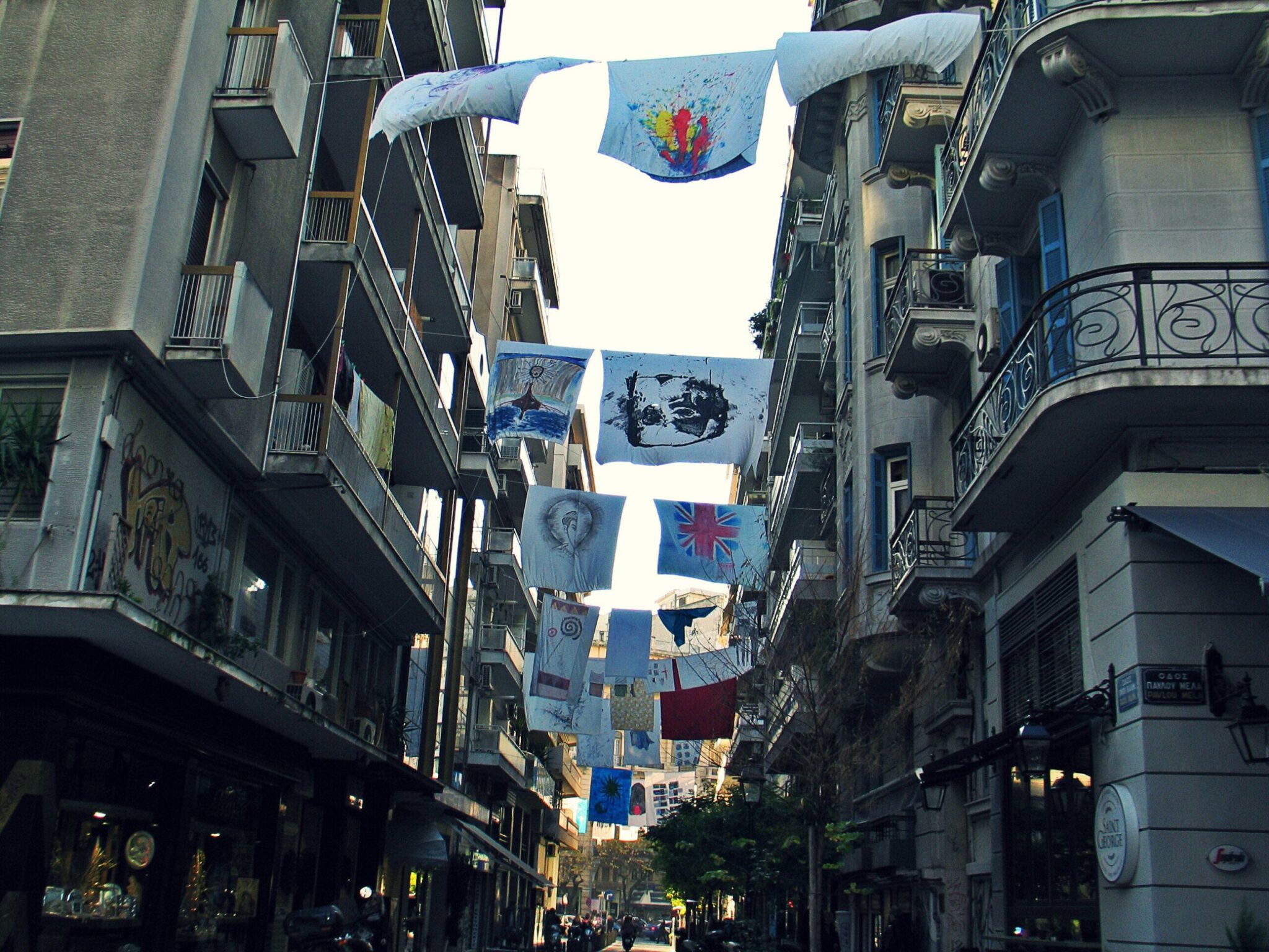 Μοιάζει με στιγμιότυπο από τραγούδι του Παύλου Παυλίδη. Ή με Φελινική μπουγάδα. Η Γρηγορίου Παλαμά, ένα στενάκι ήπιας κυκλοφορίας στην καρδιά της Θεσσαλονίκης, σε προκαλεί να σηκώσεις το κεφάλι ψηλά. «Βγάζουμε τα πλυμένα μας στη φόρα»: αυτό είναι το σχέδιο.