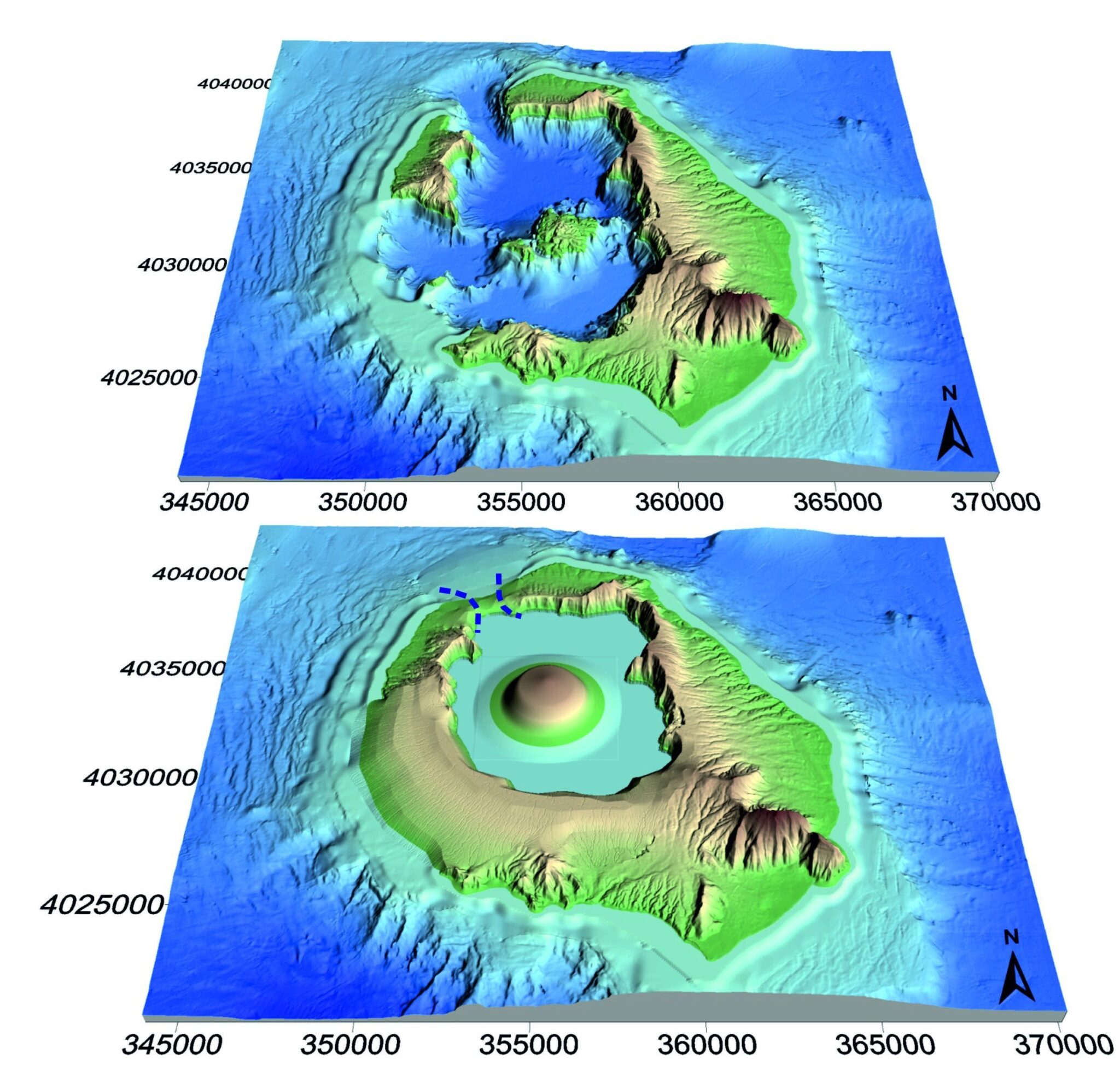 Για πρώτη φορά ξένοι και Έλληνες επιστήμονες, οι οποίοι μελέτησαν τα υποθαλάσσια απομεινάρια στο βυθό από εκείνη τη μινωική έκρηξη, καθώς και τα κομμάτια ανδεσιτικής λάβας μέσα στην ελαφρόπετρα, προχώρησαν στην ανασύσταση της λεγόμενης προ-Καμένης, καταλήγοντας σε εκτιμήσεις για την έκτασή της, τον τρόπο της δημιουργίας της και την ηλικία της.