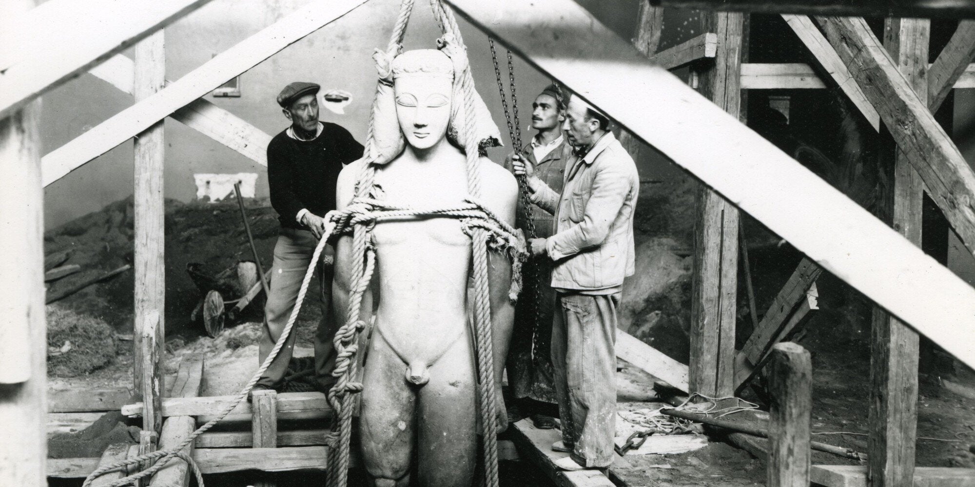 Εθνικό Αρχαιολογικό Μουσείο. 1940-1941. Απόκρυψη του κούρου του Σουνίου, των χρόνων γύρω στο 600 π.Χ., κάτω από δάπεδο αίθουσας του Μουσείου (© Εθνικό Αρχαιολογικό Μουσείο).
