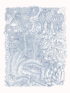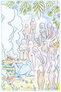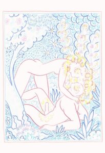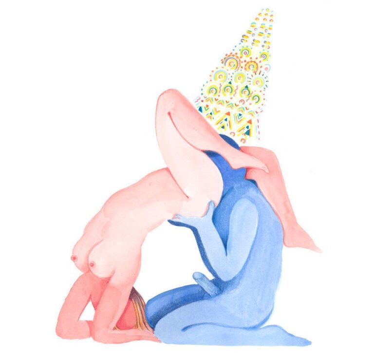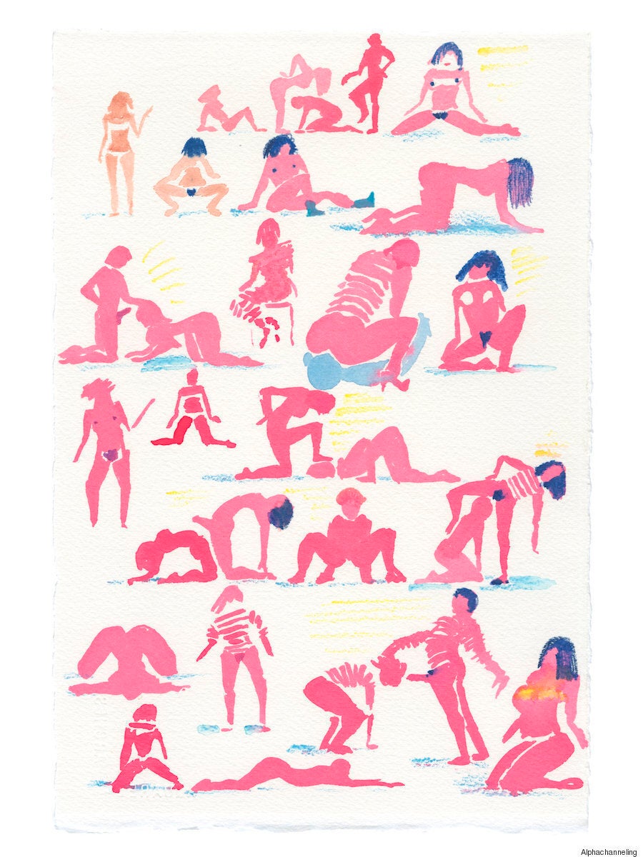 Από μακριά, τα σχέδια του Alphachanneling μοιάζουν με ζωγραφιές από παιδικό βιβλίο εξαιτίας της πολύχρωμης παλέτας του, των εύθυμων γραμμών του και του παραμυθένιου, σουρεαλιστικού τρόπου που απεικονίζει καθημερινές καταστάσεις. Αν κοιτάξεις πιο κοντά, ωστόσο, θα δεις ένα ζευγάρι να κάνει τη διαβόητη «στάση 69» ή έναν άνδρα να έχει βυθίσει το πρόσωπό του και να τρώει μέσα από ένα τεράστιο λουλούδι ή μια γυμνή γυναίκα να έχει κάτσει απαλά πάνω στο πρόσωπο ενός άνδρα. Σε αυτόν τον εξωτικό κήπο των επίγειων απολαύσεων δεν υπάρχει ντροπή.