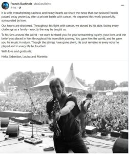 “Με βαθιά θλίψη και βαριά καρδιά, σας ανακοινώνουμε ότι ο αγαπημένος μας Francis απεβίωσε χθες μετά από μια μάχη με τον καρκίνο. Έφυγε ειρηνικά από αυτόν τον κόσμο, περιτριγυρισμένος από αγάπη.