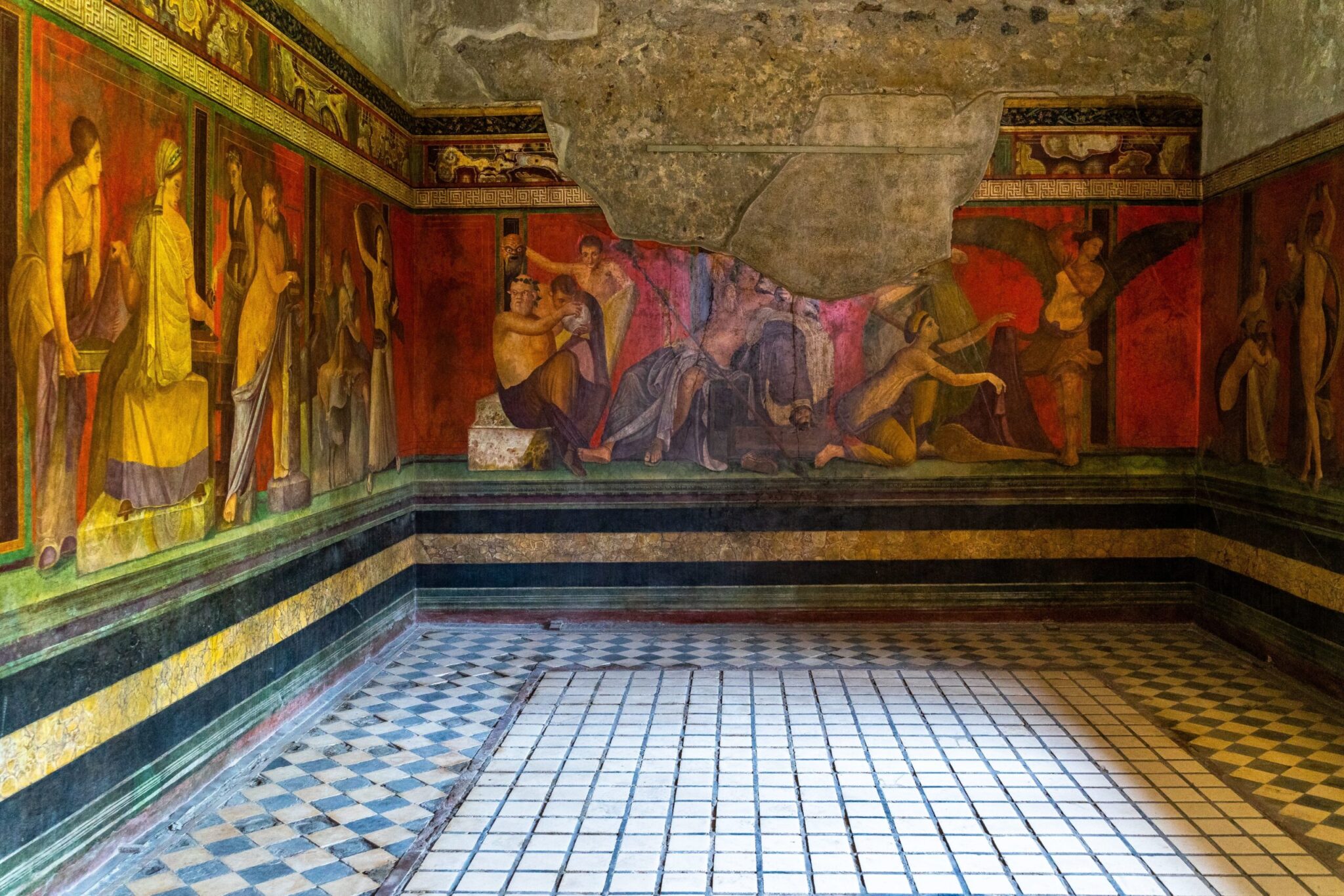 Η «Βίλα των Μυστηρίων», η οποία ονομάστηκε έτσι λόγω των τοιχογραφιών της που απεικονίζουν τα αινιγματικά τελετουργικά μύησης στο λατρευτικό κύκλο του Διονύσου, βρίσκεται έξω από τα τείχη της πόλης της Πομπηίας και, παραδόξως, υπέστη μόνο μικρές ζημιές κατά την έκρηξη του Βεζούβιου το 79 μ.Χ., με τους περισσότερους τοίχους, τις οροφές και τις τοιχογραφίες να παραμένουν ανέπαφοι.