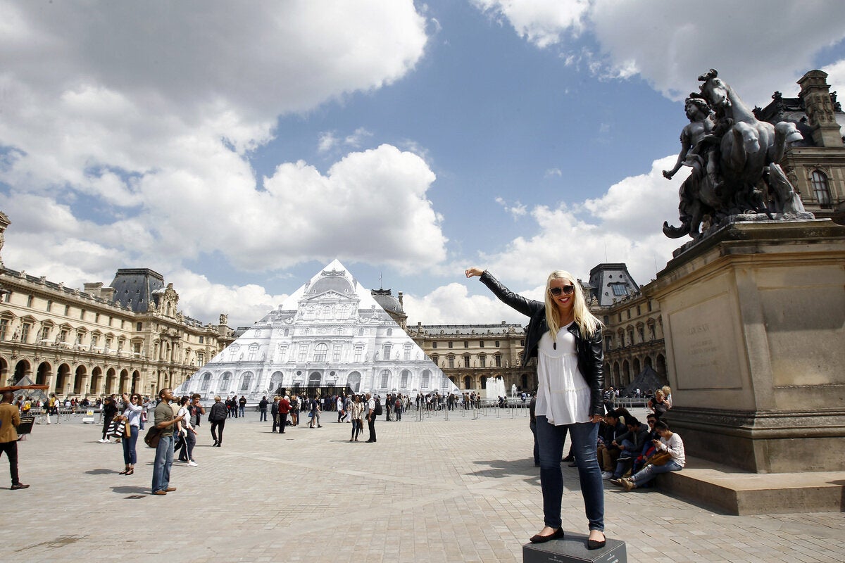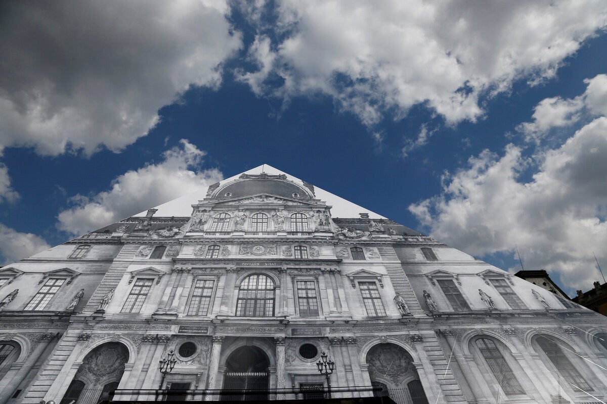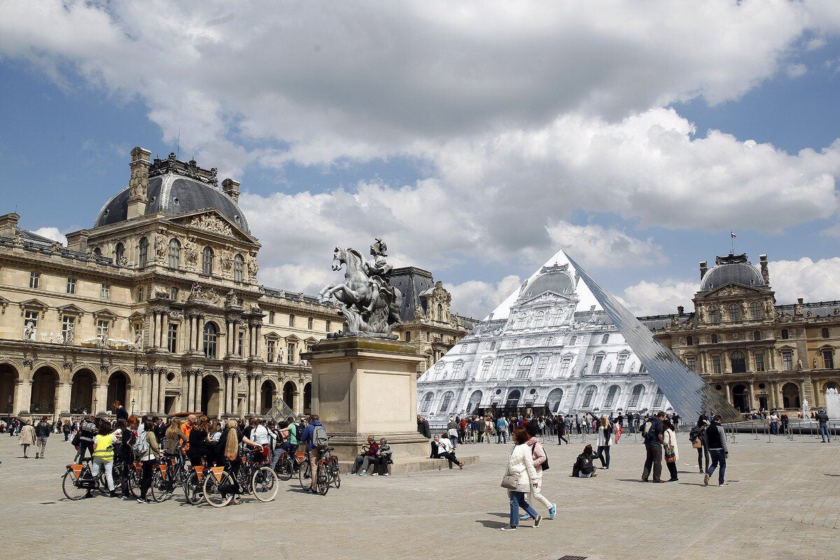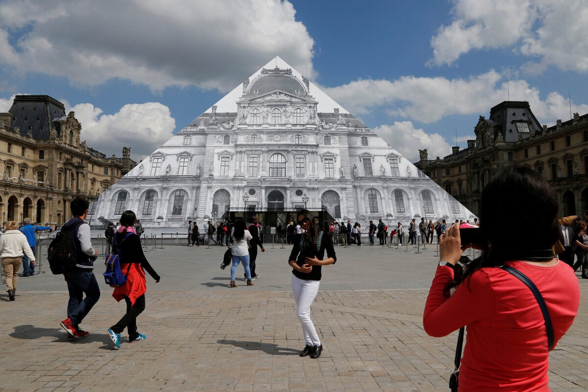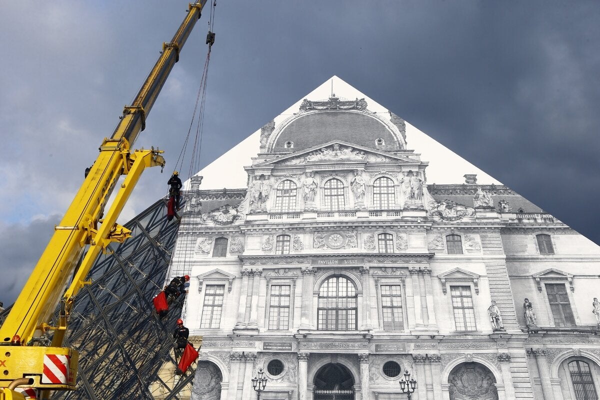 O Γάλλος καλλιτέχνης έχει δημιουργήσει μία εντυπωσιακή οπτική ψευδαίσθηση, καλύπτοντας την πυραμίδα με μία τεράστια χάρτινη φωτογραφία του μουσείου. Εάν κάποιον στέκεται στη σωστή γωνία, ευθυγραμμίζοντας την εικόνα με το κτίριο από πίσω, η πυραμίδα μοιάζει να εξαφανίζεται.