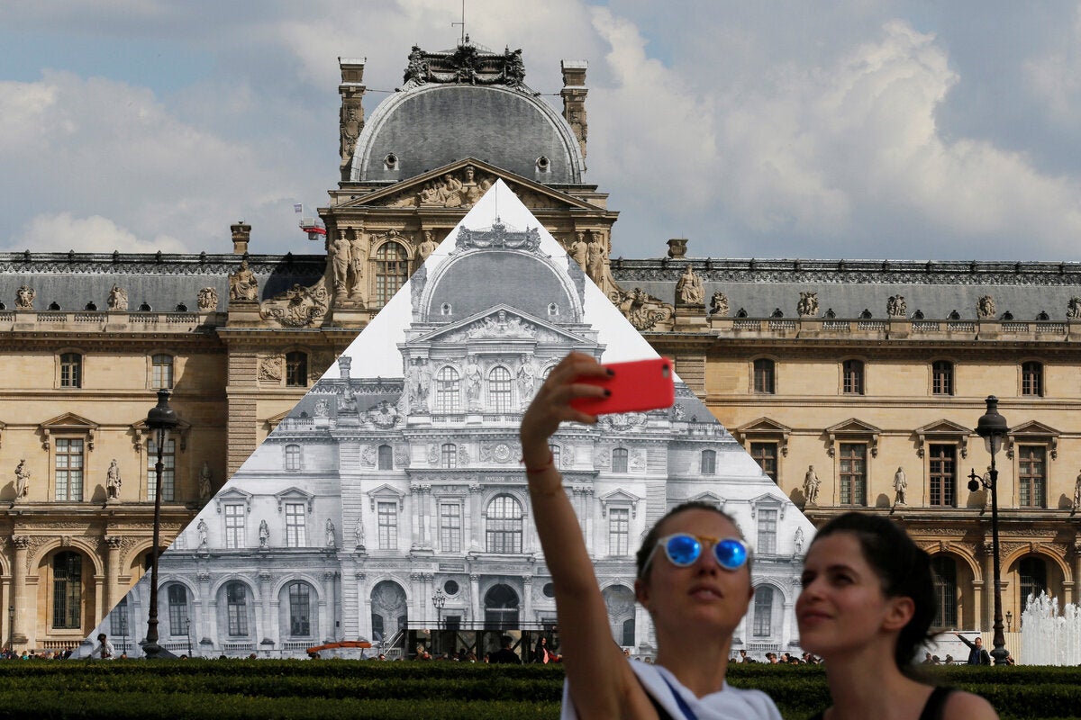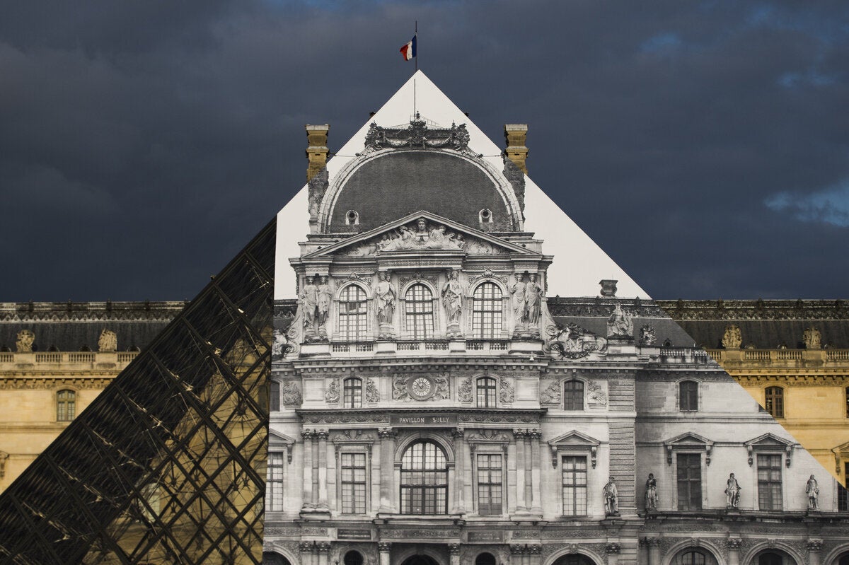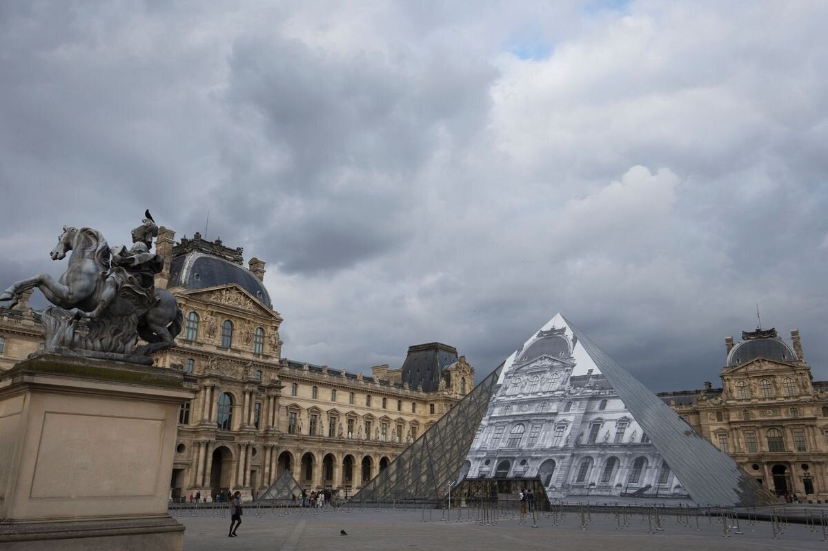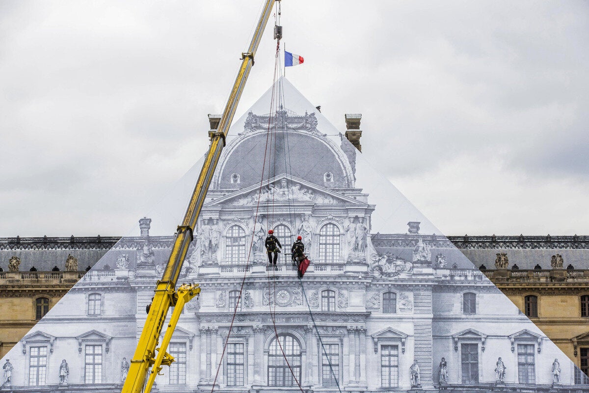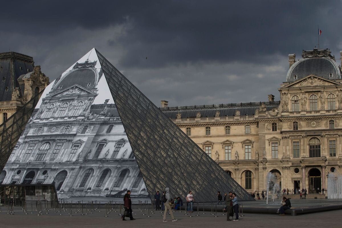 Οι επισκέπτες στο Μουσείο του Λούβρου έρχονται αντιμέτωποι με ένα ασυνήθιστο θέαμα: η κλασική πλέον γυάλινη πυραμίδα του IM Pei είναι ακόμη εκεί, αλλά κάτι περίεργο συμβαίνει, εξαιτίας ενός έξυπνου έργου τέχνης από τον JR.