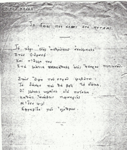Θα γράψουμε κι’ εμείς ένα εξωτικό ποίημα με τον Μιχάλη. Το «παιδί που κλαίει στο ποτάμι»« του Ούγγρου ποιητή Μίρο Μάνκα (κατασκευάζοντάς τον με τις πρώτες συλλαβές των δικών μας ονομάτων). Ένα στίχο εγώ, ένα ο Μιχάλης. Αδύνατο να θυμηθώ ποιος έχει γράψει ποιον στίχο. Ίσως είναι το πρώτο συλλογικό ποίημα που έχει γραφτεί.