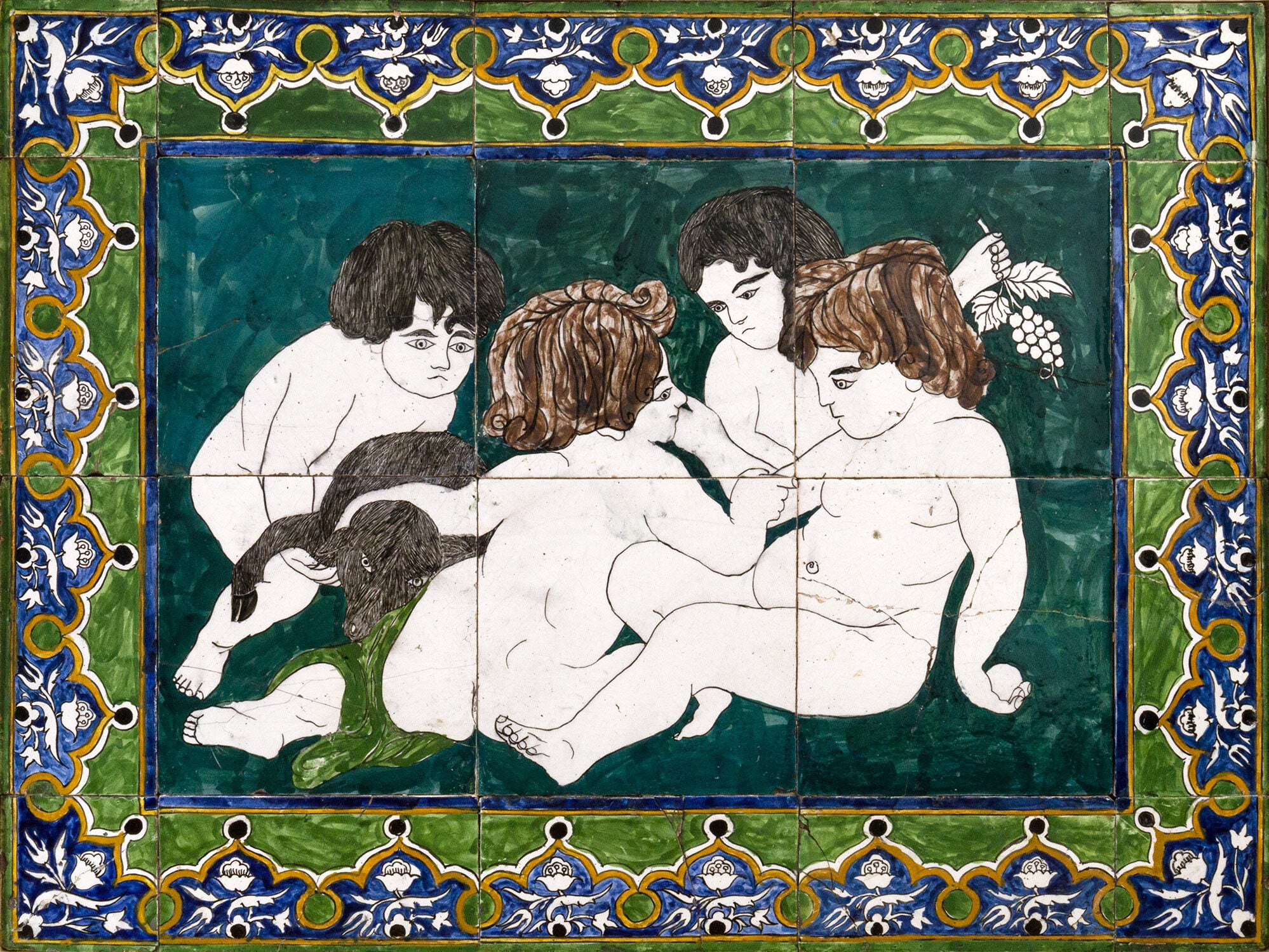 Πάνελ από κεραμικές πλάκες με ερωτιδείς που αγκαλιάζουν μικρό κατσίκι, φτιαγμένο από τον Μηνά Αβραμίδη. Πάνελ πλακιδίων με παρόμοιο θέμα ανήκει στη συλλογή του Μουσείου Νεότερου Ελληνικού Πολιτισμού.