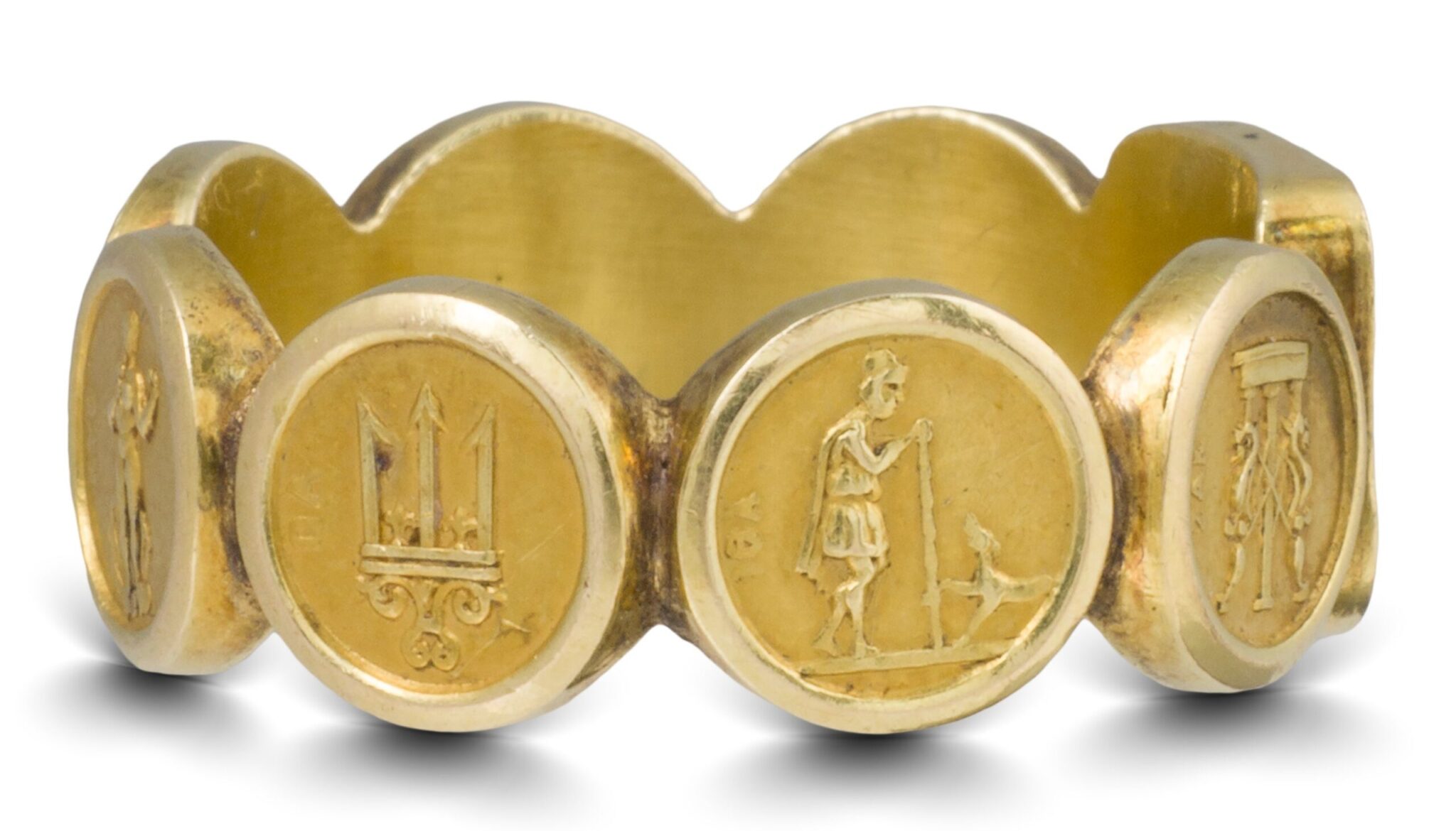 Χρυσό δακτυλίδι με τα σύμβολα των επτά Ιονίων νήσων που ανήκε στον εθνικό μας ποιητή Διονύσιο Σολωμό κατασκευασμένο το δεύτερο τέταρτο του 19ου αιώνα. Παρεμφερές δακτυλίδι με επτά κυκλικά μετάλλια, χωρίς το μονόγραμμα του ποιητή, φυλάσσεται σήμερα στη συλλογή του Βρετανικού Μουσείου.