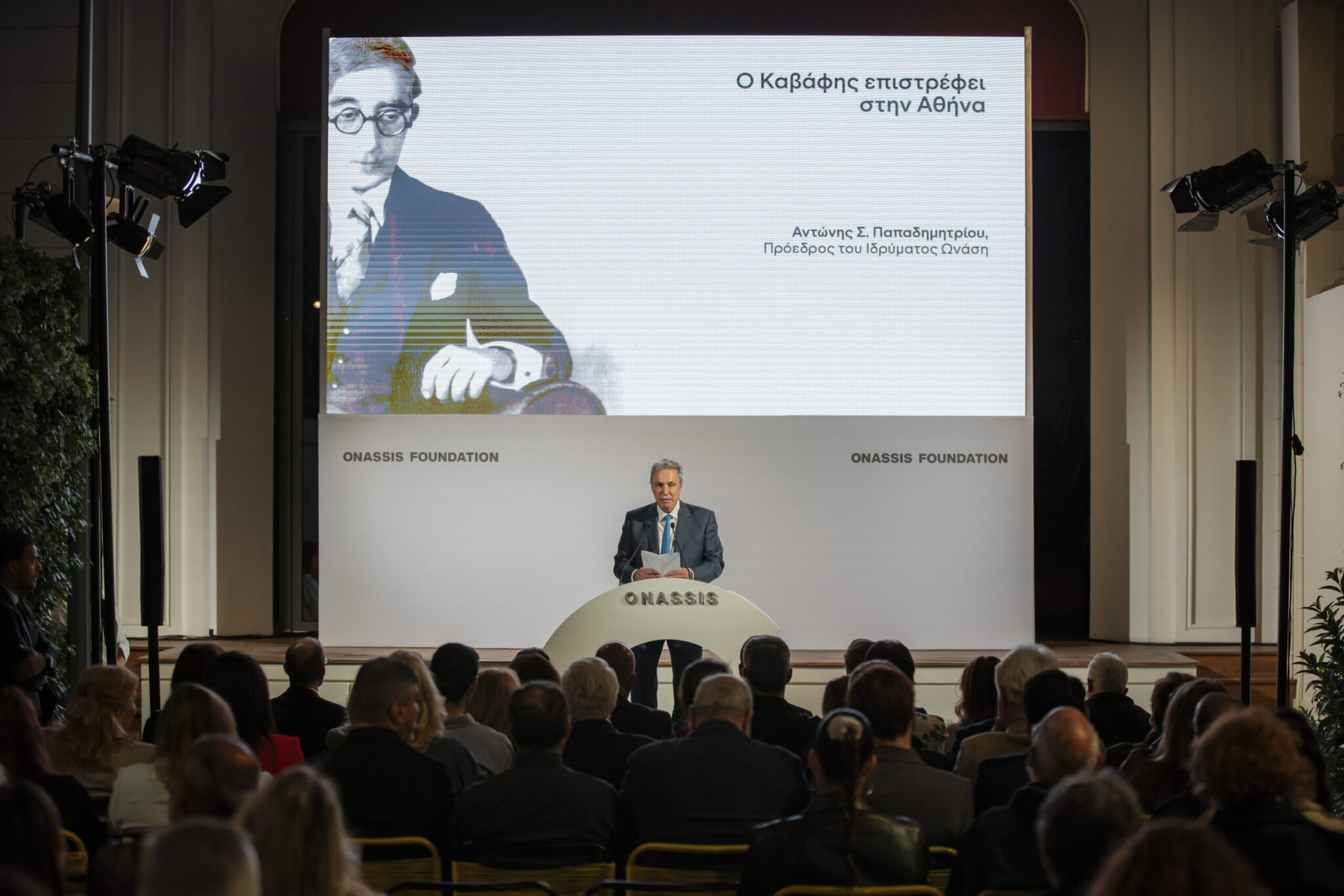 «Το γλυπτό του Κωνσταντίνου Π. Καβάφη αποτελεί δωρεά του Ιδρύματος προς τον Δήμο Αθηναίων, στο πλαίσιο της ανάπλασης της Διονυσίου Αρεοπαγίτου. Πρόκειται για μια πρωτοβουλία που μετράει πολλά χρόνια και επιδιώκει να ενισχύσει τον χαρακτήρα της Αθήνας ως τόπο πολιτισμού, ανοιχτό και προσβάσιμο σε όλους», σημειώσε ο κ. Παπαδημητρίου και πρόσθεσε: «Δεν είναι, άλλωστε, τυχαία η σχέση του Ιδρύματος Ωνάση με τον Αλεξανδρινό ποιητή, ιδίως από τη στιγμή που επιλέξαμε την ελεύθερη και ανοιχτή πρόσβαση στο Αρχείο Καβάφη, προβάλλοντας το έργο του μέσα από συνεχείς δράσεις, εντός και εκτός Ελλάδας. Πρόκειται για μια σχέση που βασίζεται σε μια ολιστική προσέγγιση. Από το 2017, Έλληνες και ξένοι ερευνητές, στο πλαίσιο του Διεθνούς Θερινού Σχολείου Καβάφη, διευρύνουν την «ανάγνωση» του Καβαφικού έργου, από τις κινηματογραφικές σπουδές έως τον οπτικό πολιτισμό. Το Ίδρυμα Ωνάση, άλλωστε, ανέλαβε τη χορηγία για την αποκατάσταση της Οικίας Καβάφη στην Αλεξάνδρεια, σε συνεργασία με το Ελληνικό Ίδρυμα Πολιτισμού. Και, ως επιστέγασμα αυτής της διαχρονικής σύνδεσης με τον ποιητή, εγκαινίασε το 2023, λίγα μέτρα πιο μακριά από το σημείο όπου βρισκόμαστε σήμερα, τη νέα «στέγη» του Αρχείου Καβάφη, στην οδό Φρυνίχου στην Πλάκα, όπου στεγάζονται πλέον το αρχείο, η βιβλιοθήκη του, καθώς και μια συλλογή προσωπικών του αντικειμένων και εικαστικών έργων που εμπνέονται από τον ίδιο».