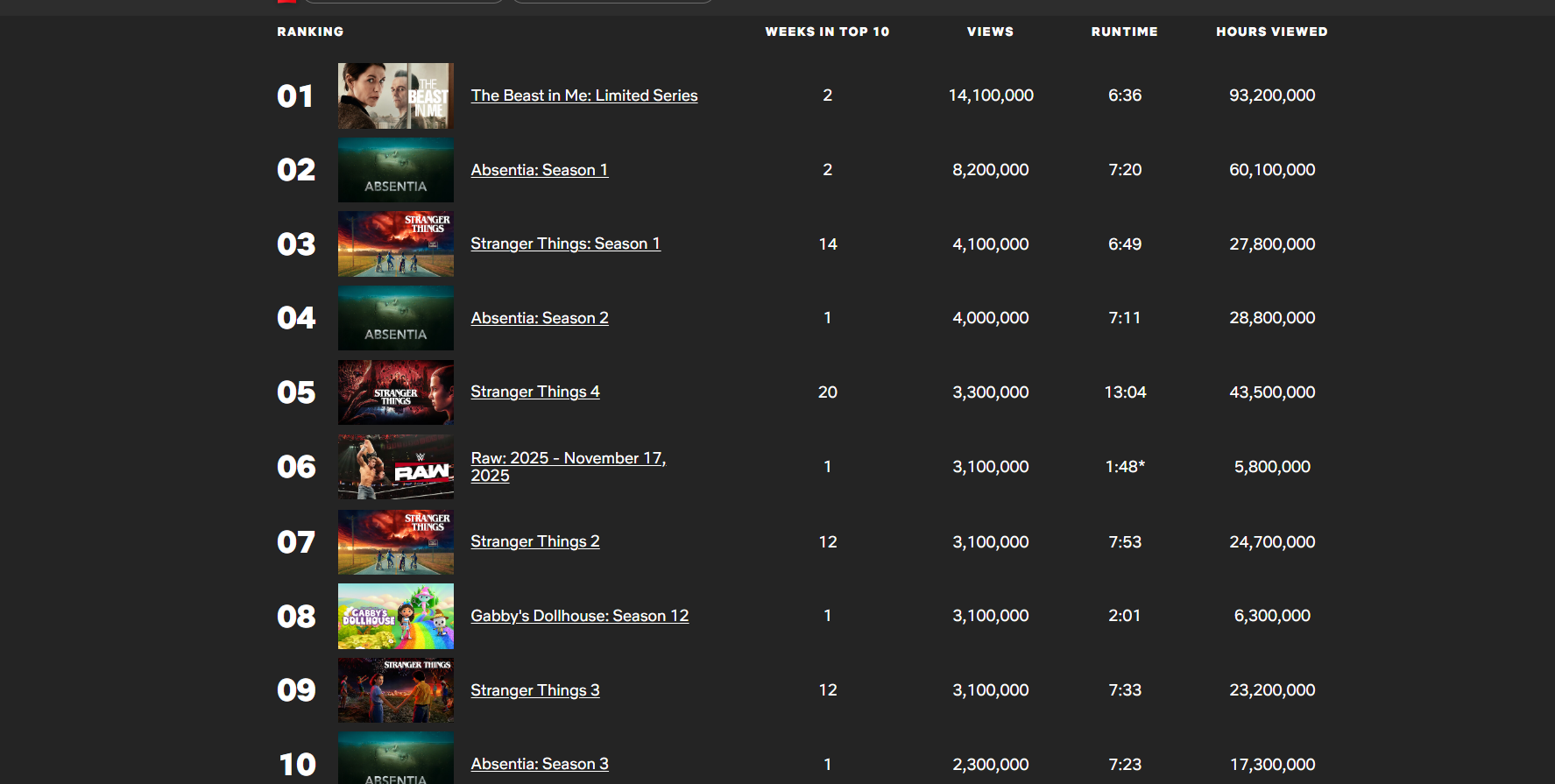 Την ίδια εβδομάδα, μόνο δύο σειρές ξεπέρασαν την πρώτη σεζόν του «Stranger Things»: το «The Beast in Me», που βρέθηκε στην κορυφή με 14,1 εκατομμύρια προβολές και η πρώτη σεζόν του «Absentia», η σειρά του Amazon Prime Video η οποία προστέθηκε πρόσφατα στο Netflix.