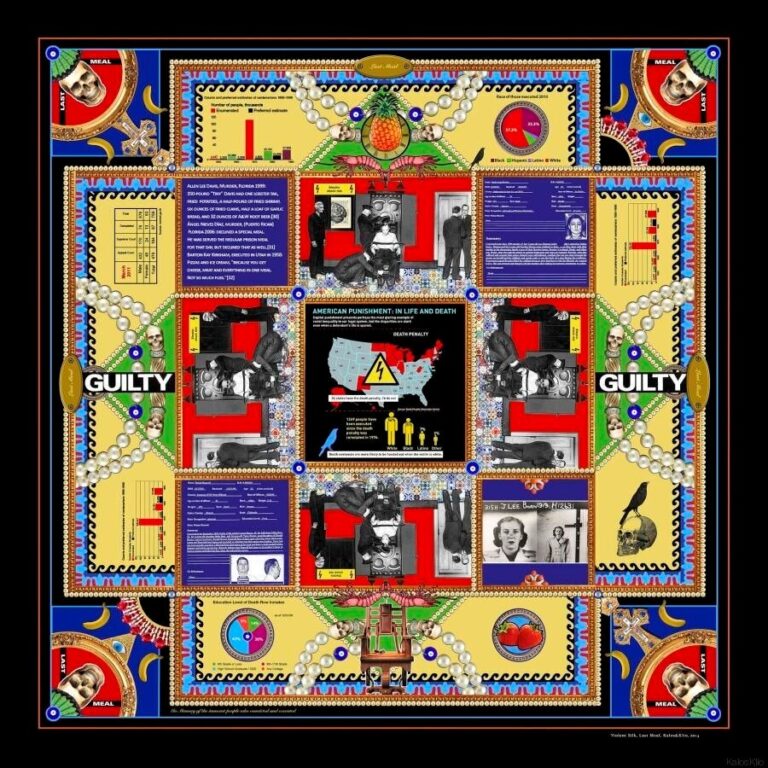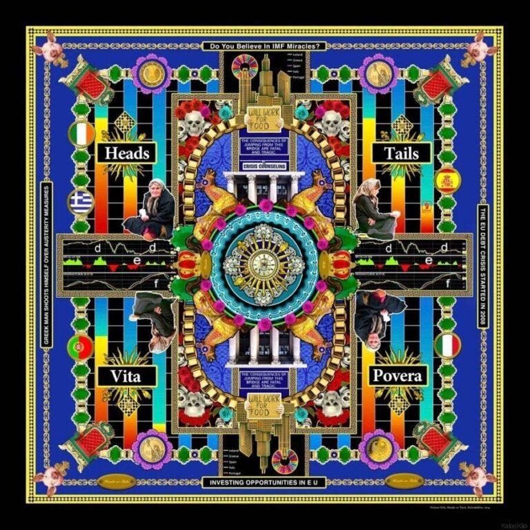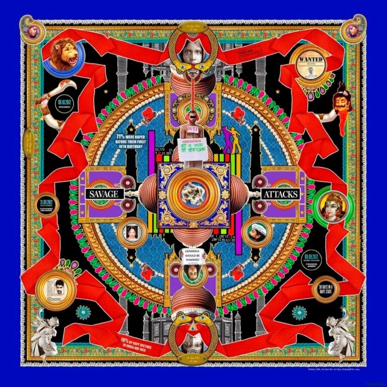 Τα πολύχρωμα και ψυχεδελικά διακοσμητικά μοτίβα κάθε μεταξωτού πέπλου αναφέρονται σε διαφορετικό παράδειγμα «βίας» και ενσωματώνουν υλικό που προέρχεται από εκτενή έρευνα στο διαδίκτυο: φωτογραφίες, απεικονίσεις δεδομένων και στατιστικών στοιχείων, χάρτες και διαγράμματα τα οποία σχετίζονται με παραβιάσεις των ανθρωπίνων δικαιωμάτων και διαφορετικές εκφάνσεις βίας και θανάτου στον σύγχρονο κόσμο. Η λαμπερή υλικότητα του μεταξιού έρχεται σε αντιπαράθεση με τη σκοτεινή θεματική της βίας που αποτυπώνεται στην εικονογραφία των πέπλων, με σκοπό να κάνει ορατή την άρρηκτη σχέση του προηγμένου πολιτισμού μας με τη βία διαχρονικά.