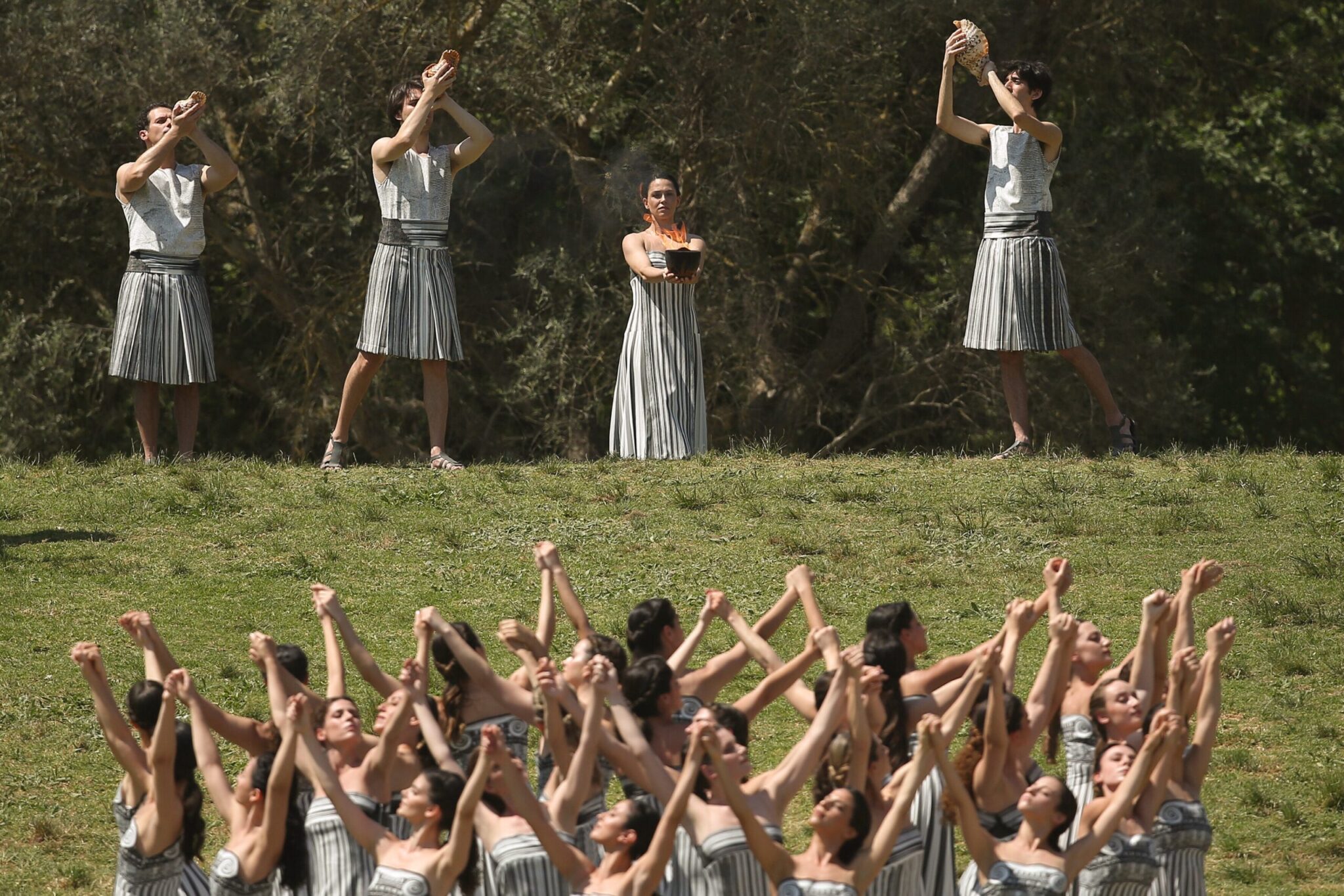 ΑΡΧΑΙΑ ΟΛΥΜΠΙΑ, ΕΛΛΑΔΑ - 15 ΑΠΡΙΛΙΟΥ: Οι ερμηνευτές λαμβάνουν μέρος στην πρόβα της τελετής αφής της φλόγας για τους Ολυμπιακούς Αγώνες του Παρισιού, στην Αρχαία Ολυμπία, Ελλάδα στις 15 Απριλίου 2024. (Photo by Stringer/Anadolu via Getty Images)