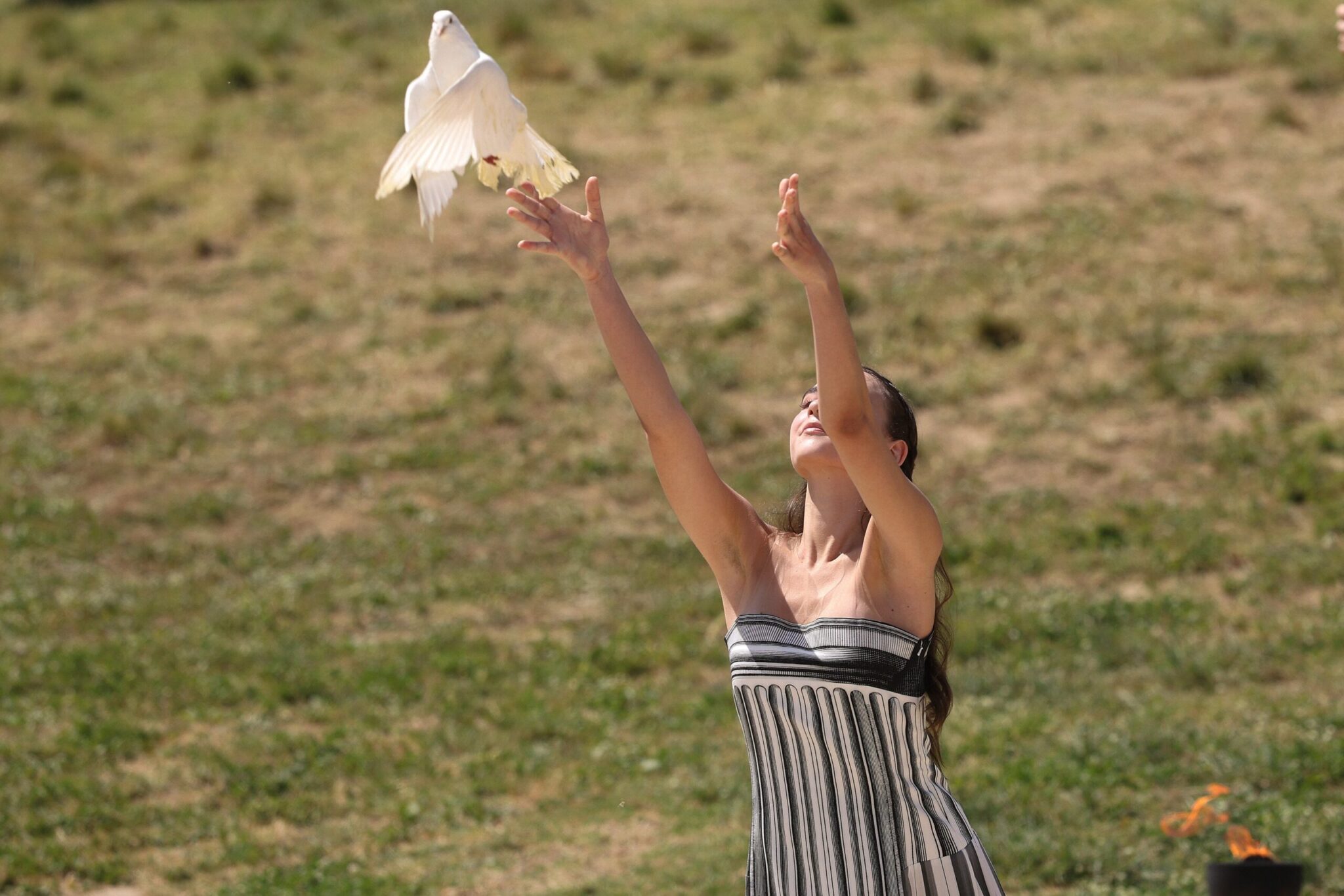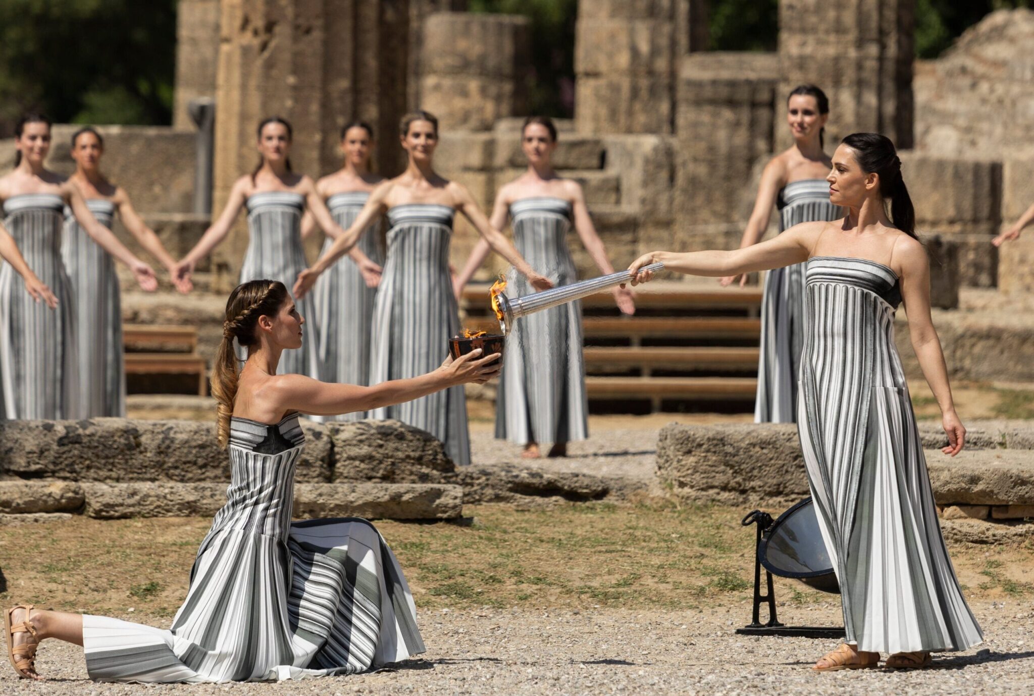 Η ιέρεια, γονατισμένη με το μακρύ της φόρεμα μπροστά σε έναν ερειπωμένο ελληνικό ναό, εστίασε τις ακτίνες του φλεγόμενου ήλιου στον μεταλλικό πυρσό της. Η φλόγα που άναψε μπροστά στο Ναό της Ήρας θα φυλάσσεται ως εφεδρική, σε περίπτωση που ο συννεφιασμένος ουρανός ”εκτροχιάσει” την τελετή την Τρίτη 16 Απριλίου, στην οποία θα παραστούν κορυφαία στελέχη της Διεθνούς Ολυμπιακής Επιτροπής και διοργανωτές από την Γαλλία.