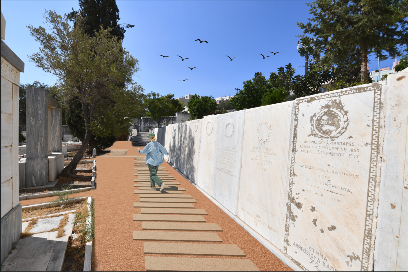 Η αρχιτεκτονική πρόταση βασίζεται στις -διεθνώς- αναγνωρισμένες αρχές συντήρησης και ανάδειξης μνημειακών χώρων, αντλώντας παραδείγματα καλών πρακτικών από ευρωπαϊκά εμβληματικά νεκροταφεία. Η πρόταση ανάδειξης του κοιμητηρίου περιλαμβάνει τρεις διακριτούς τομείς, καθένας εκ των οποίων διαθέτει ιδιαίτερα τυπολογικά, μορφολογικά και ιστορικά χαρακτηριστικά, τα οποία αναδεικνύονται με στοχευμένες ήπιες επεμβάσεις. Ο χώρος εισόδου διαμορφώνεται ως υπαίθριος εκθεσιακός χώρος, όπου επανεντάσσονται ιστορικές επιτύμβιες πλάκες και λιθανάγλυφα. Οι τοίχοι λειτουργούν ως εκθεσιακές επιφάνειες και τοποθετούνται ενημερωτικές πινακίδες για την ιστορία και τη δομή του χώρου. Σχεδιάζεται διακριτικός αρχιτεκτονικός φωτισμός με στόχο την ανάδειξη των μνημείων και τη διατήρηση της ατμόσφαιρας μνήμης και περισυλλογής.
