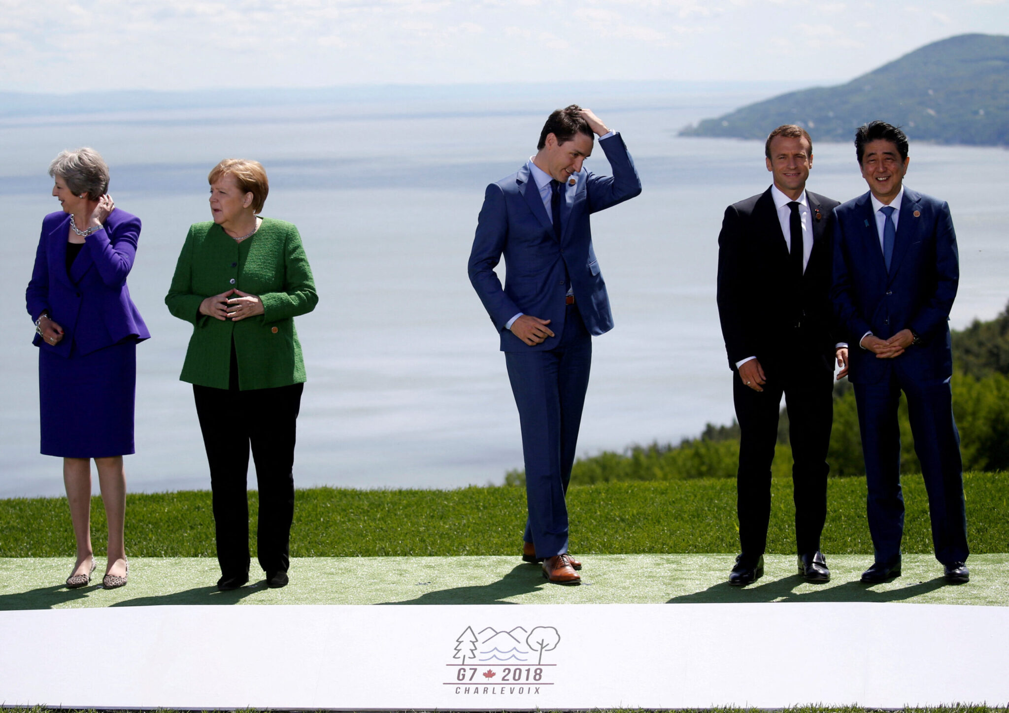 Η βρετανίδα πρωθυπουργός Τερέζα Μέι, η γερμανίδα καγκελάριος Άνγκελα Μέρκελ, ο καναδός πρωθυπουργός Τζάστιν Τρουντό, ο γάλλος πρόεδρος Εμανουέλ Μακρόν και ο ιαπωνός πρωθυπουργός Σίνζο Άμπε περιμένουν τον αμερικανό πρόεδρο Ντόναλντ Τραμπ να τους συναντήσει για μια οικογενειακή φωτογραφία στη σύνοδο κορυφής της G7 στο Σαρλεβουά, Κεμπέκ, Καναδάς, 8 Ιουνίου 2018.