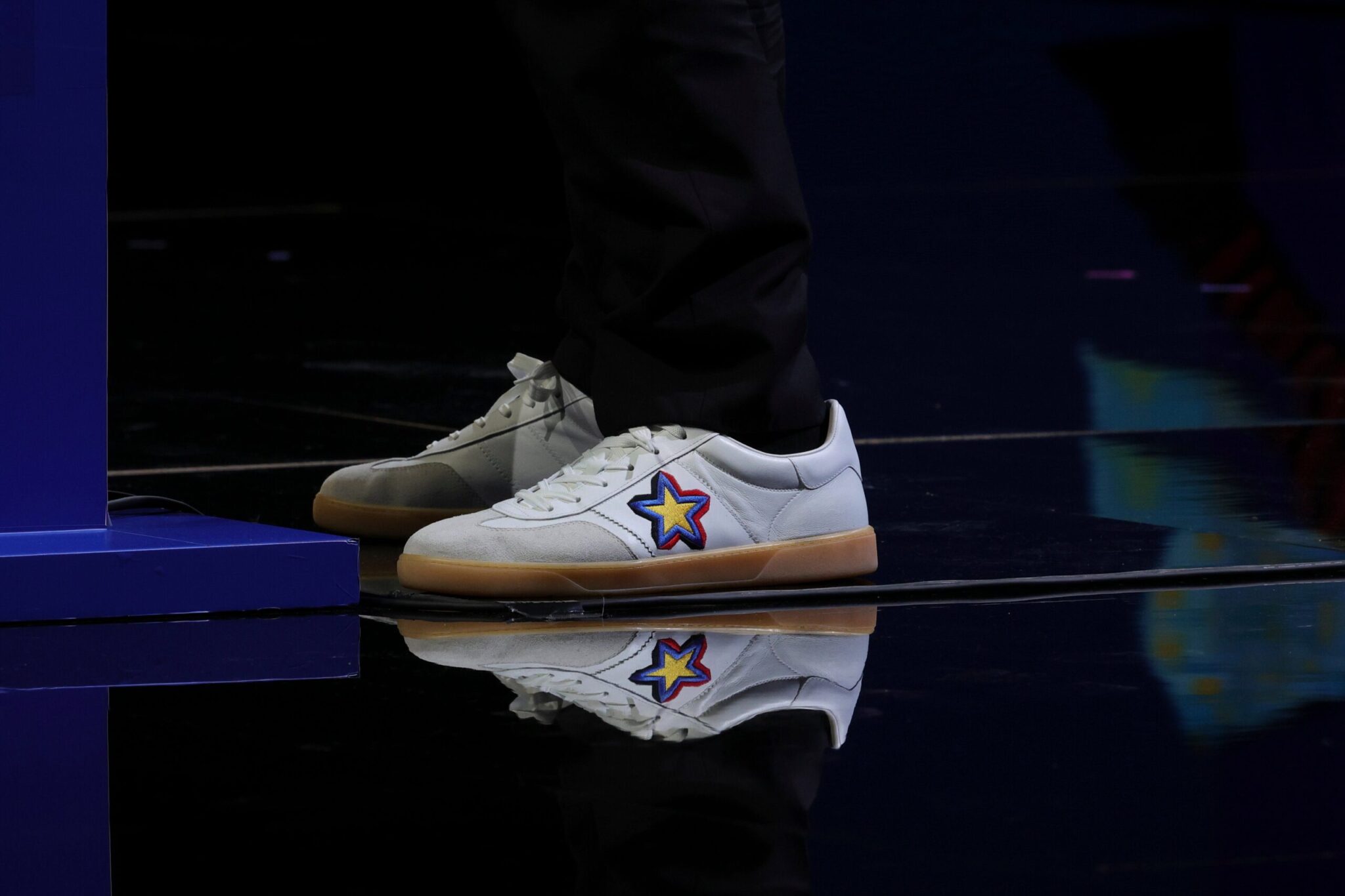 Τα παπούτσια του πρωθυπουργού της Αλβανίας Έντι Ράμα αντανακλώνται στο πάτωμα κατά τη διάρκεια συνέντευξης Τύπου με την πρωθυπουργό της Δανίας Μέτε Φρέντερικσεν μετά τη Σύνοδο Κορυφής της Ευρωπαϊκής Πολιτικής Κοινότητας, στα Τίρανα της Αλβανίας, Παρασκευή 16 Μαΐου 2025. (AP Photo/Vlasov Sulaj)via Associated Press