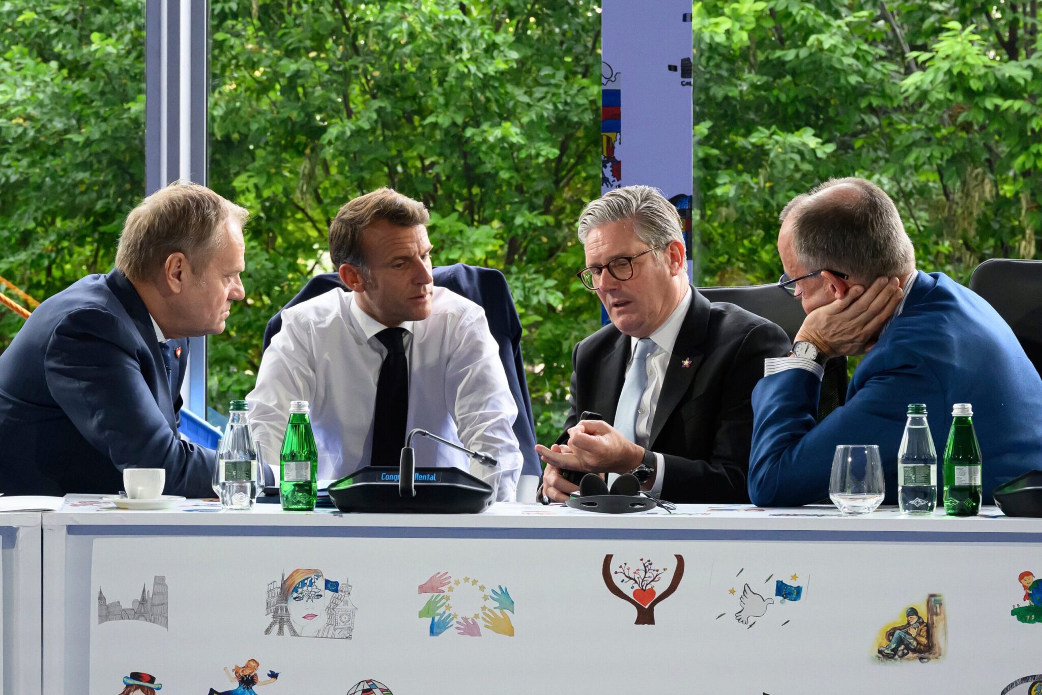 Από αριστερά, ο πρωθυπουργός της Πολωνίας Ντόναλντ Τουσκ, ο πρόεδρος της Γαλλίας Εμανουέλ Μακρόν, ο πρωθυπουργός της Βρετανίας Κιρ Στάρμερ και ο καγκελάριος της Γερμανίας Φρίντριχ Μερτς μιλούν κατά τη διάρκεια της συνεδρίασης για την ασφάλεια της Ουκρανίας στην 6η Σύνοδο Κορυφής της Ευρωπαϊκής Πολιτικής Κοινότητας την Παρασκευή 16 Μαΐου 2025 στα Τίρανα της Αλβανίας. (Leon Neal/Pool via AP)