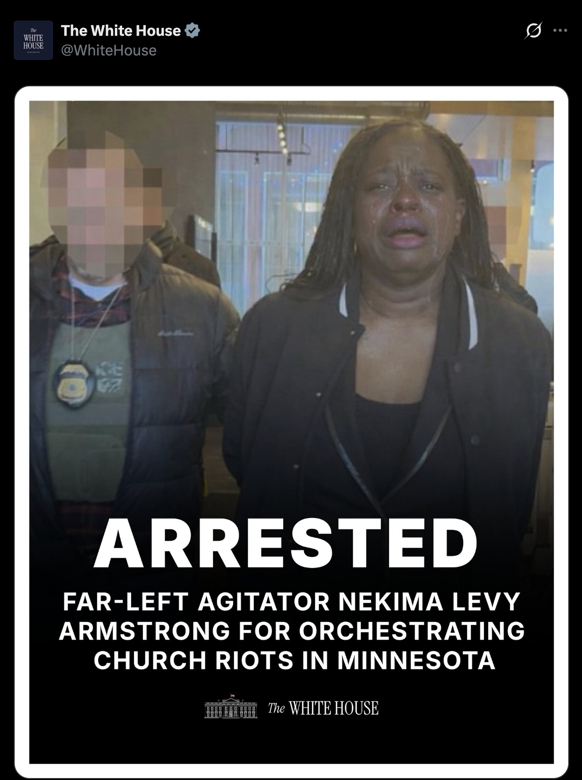 Περίπου 30 λεπτά αργότερα, ο Λευκός Οίκος δημοσίευσε μια άλλη φωτογραφία από τη σύλληψη της Άρμστρονγκ, στην οποία όμως φαίνεται να κλαεί σπαρακτικά ενώ το χρώμα του δέρματός της είναι εμφανώς πιο σκούρο.
