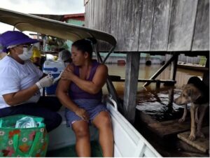 Η Μαράϊρ κάνει το εμβόλιο της AstraZeneca από την νοσηλεύτρια Νούδα Σόουσα σε πλωτό κέντρο στον ποταμό Σολιμόες.  Bruno Kelly/Reuters