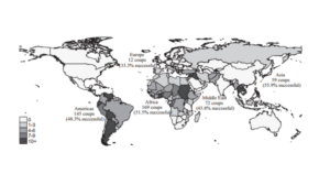 Το παρακάτω γράφημα δείχνει τον αριθμό πραξικοπημάτων ανά χώρα σε παγκόσμιο επίπεδο καθώς και το ποσοστό επιτυχίας τους από το 1950 έως το 2010. Όπως φαίνεται από το διάγραμμα ο μεγαλύτερος αριθμός πραξικοπημάτων έχει εκδηλωθεί στην Αφρική με 169 και την Νότια Αμερική στην δεύτερη θέση με 145. Όσον αφορά το ποσοστό επιτυχίας η Ασία κατέχει το υψηλότερο ποσοστό με 55.9% με δεύτερη την Αφρική με 51.5%. Στην Ευρώπη έχουν εκδηλωθεί μόλις 12 πραξικοπήματα με ποσοστό επιτυχίας 33.3%. Ο μέσος όρος επιτυχίας των πραξικοπημάτων παγκοσμίως ανέρχεται στο 46.96%. Άρα λίγο περισσότερα από τα μισά πραξικοπήματα συνήθως αποτυγχάνουν.