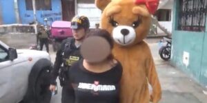 🧸💔| Efectivos del #GrupoTerna, Región Policial Lima, uno de ellos mimetizado de osito de peluche cariñosito, capturaron en San Martín de Porres a dos microcomercializadoras de droga.
