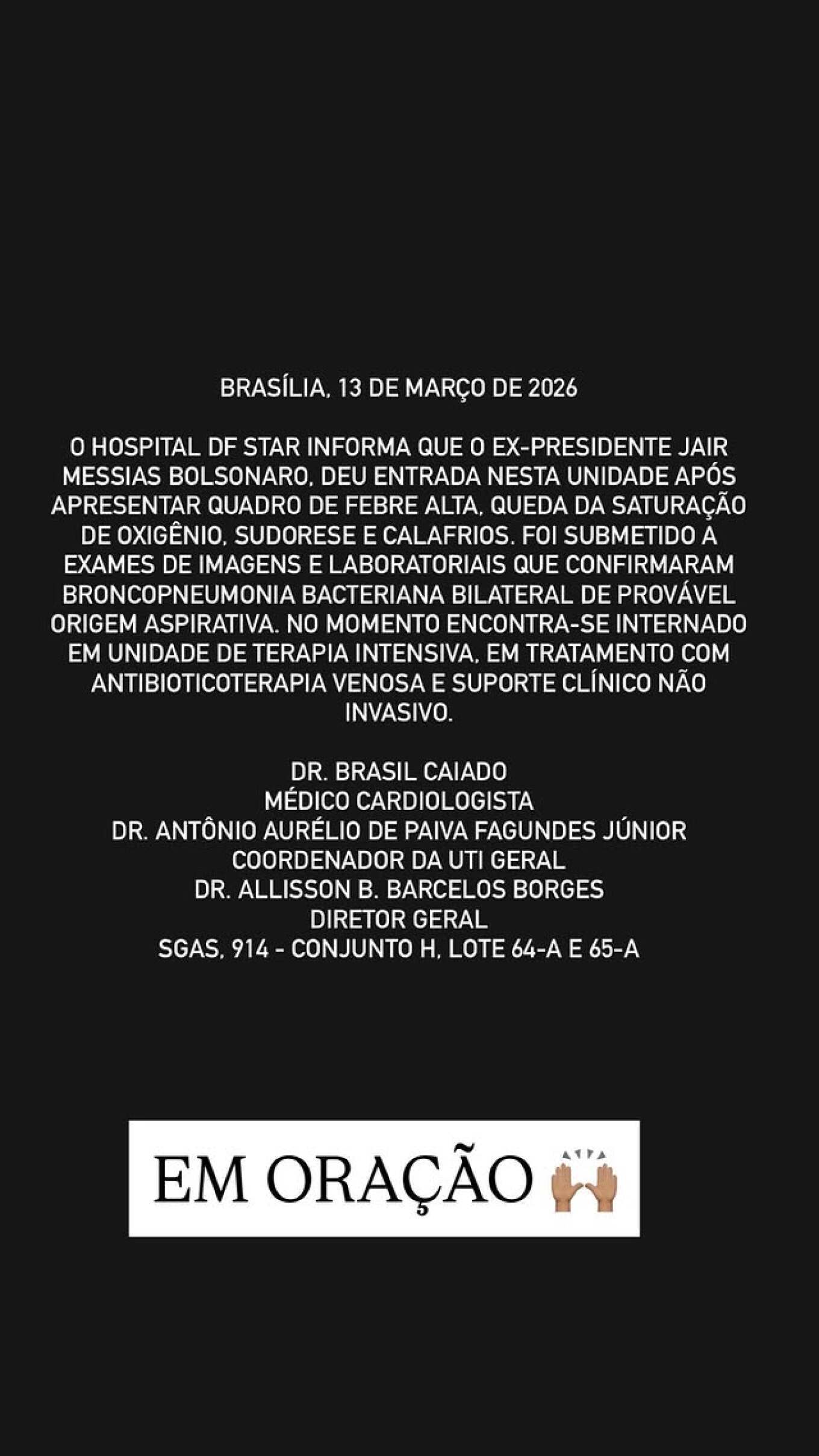 Ο 70χρονος πρώην πρόεδρος μεταφέρθηκε στην ιδιωτική κλινική DF Star της Μπραζίλια αφού «ανέβασε υψηλό πυρετό, εμφάνισε μειωμένο κορεσμό οξυγόνου και ρίγη» ανέφερε το ιατρικό ανακοινωθέν που ανάρτησε η σύζυγός του, Μισέλ Μπολσονάρου, στο Instagram.