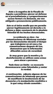 «Μετά την άρνηση της Εισαγγελίας της Ισπανίας να μου επιτρέψει να ασκήσω την υπεράσπισή μου στη διαδικασία και να μου παράσχει επίσημη πρόσβαση στην καταγγελία, αναγκάζομαι να τοποθετηθώ δημόσια», σημειώνει. Και προσθέτει: «Αυτό είναι το μόνο μέσο που μου επιτρέπει να ασκήσω νόμιμα το δικαίωμα υπεράσπισής μου και να καταστήσω σαφή την απόλυτη ανακρίβεια των καταγγελθέντων γεγονότων».