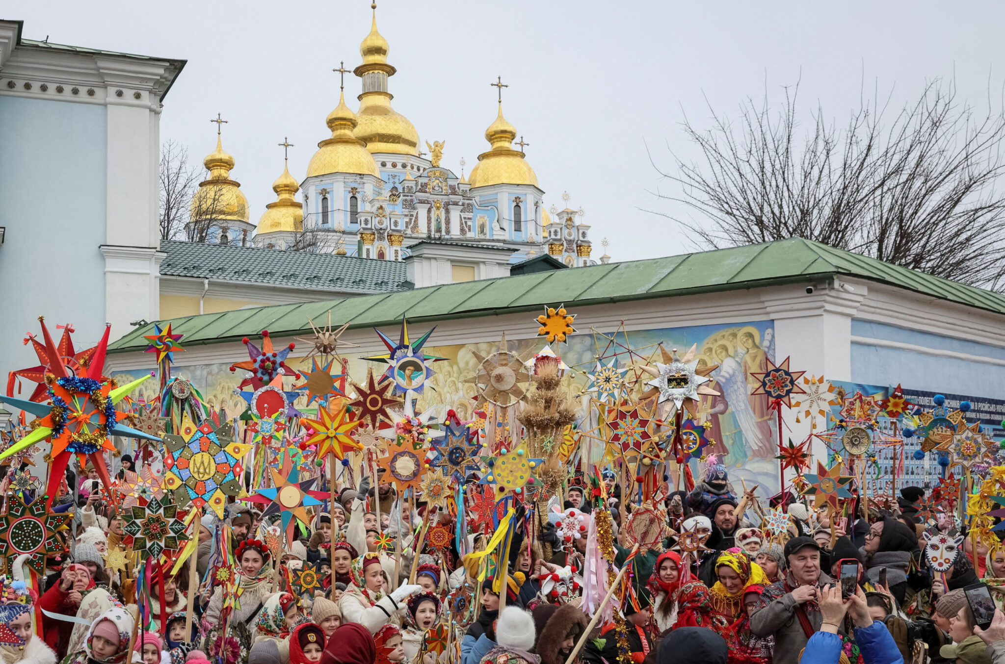 Άνθρωποι ντυμένοι με παραδοσιακές ουκρανικές φορεσιές συμμετέχουν στους εορτασμούς των Χριστουγέννων, εν μέσω της ρωσικής επίθεσης κατά της Ουκρανίας, στο Κίεβο της Ουκρανίας, στις 25 Δεκεμβρίου 2025. REUTERS/Gleb Garanich
