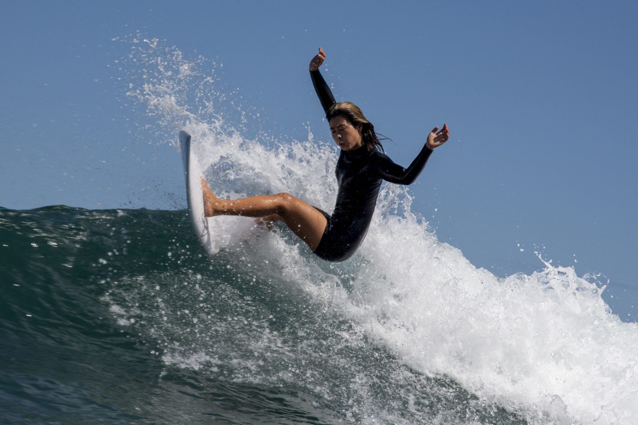 Η Ιαπωνέζα Mahina Maedagoes δαμάζει ένα κύμα κατά τη διάρκεια προπόνησής της στην παραλία Tsurigasaki στην Τσίμπα ( 24 Ιουλίου, 2021).
