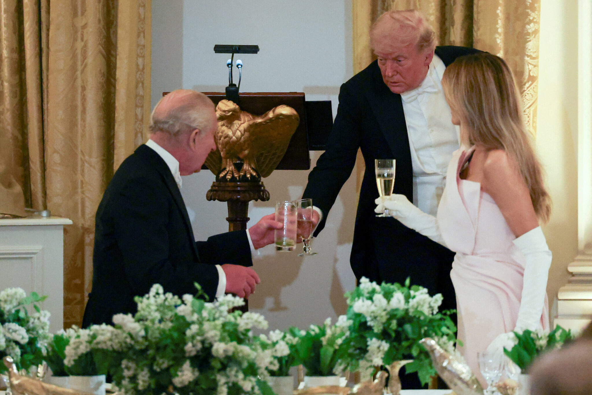 Μετά το τέλος των ομιλιών, ο πρόεδρος των ΗΠΑ και ο βασιλιάς Κάρολος ύψωσαν τα ποτήρια τους, σηματοδοτώντας τη λήξη του επίσημου σκέλους της βραδιάς.