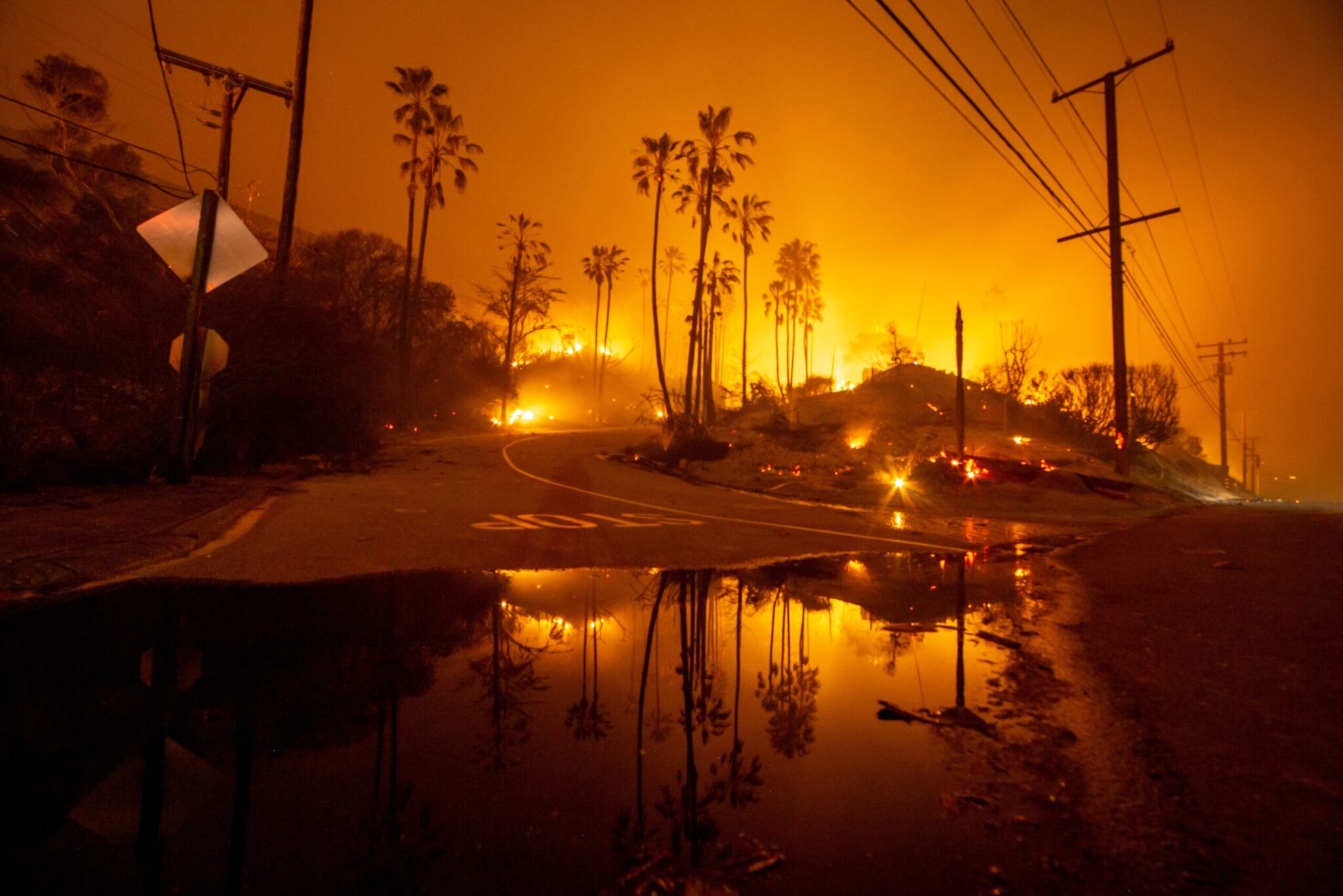 Οι πυροσβέστες δίνουν μάχη με τις φλόγες στις δύο άκρες της Πολιτείας: στην κομητεία Μπατ (βόρεια), όπου μαίνεται η μεγαλύτερη εστία που έχει στοιχίσει τη ζωή σε τουλάχιστον 23 ανθρώπους, και γύρω από το Λος Άντζελες και το Μαλιμπού (νότια).