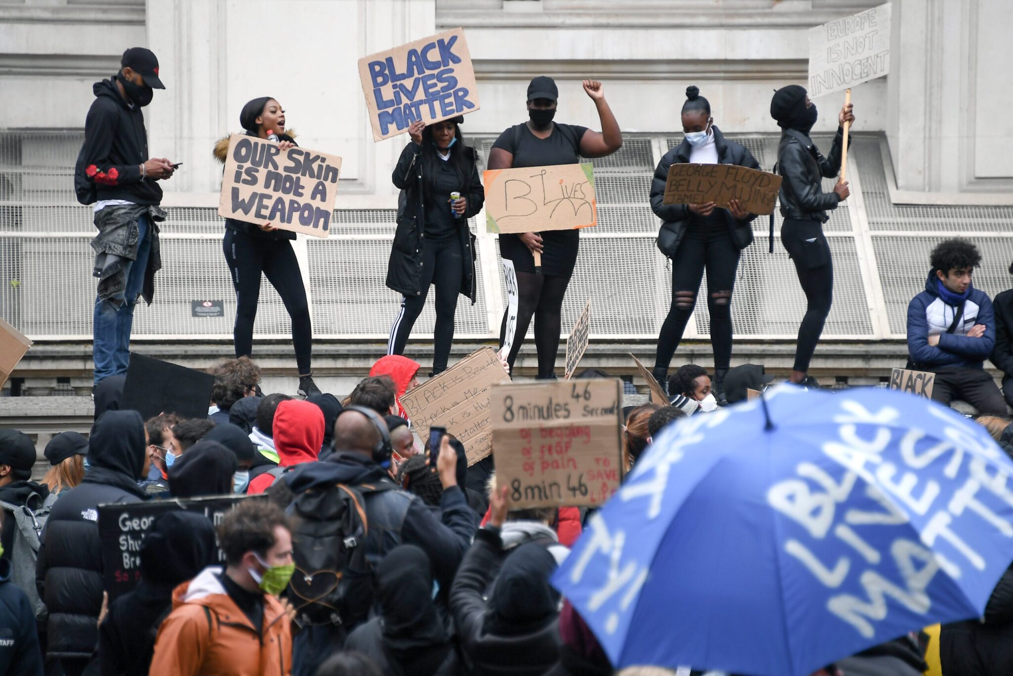 Στο Λονδίνο, εκατοντάδες άνθρωποι συγκεντρώθηκαν έξω από το κτίριο του κοινοβουλίου, κρατώντας πλακάτ με το σύνθημα «Οι ζωές των μαύρων μετρούν» και χτυπώντας ταμπούρλα. Οι περισσότεροι δεν τηρούσαν αποστάσεις, ορισμένοι όμως φορούσαν προστατευτικές μάσκες. «Ήρθε η ώρα να μετατρέψουμε τον ρατσισμό σε στάχτη!» φώναζε μια διαδηλώτρια με ντουντούκα. «Το Ηνωμένο Βασίλειο δεν είναι αθώο», κατήγγειλαν οι διαδηλωτές, αναφερόμενοι στον ρατσισμό και την αστυνομική βία.