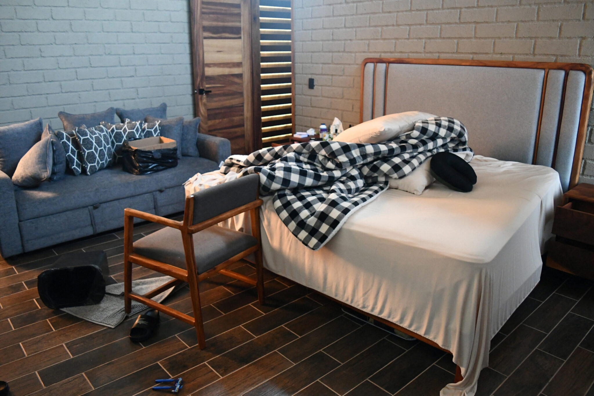 Στην κουζίνα, ο πάγκος ήταν γεμάτος με κουτιά φαγητού από delivery, μπουκάλια σάλτσας sriracha, γάλα και νερό, ενώ στο πάτωμα υπήρχαν ένα κουτί με πατάτες και ένα με ντομάτες. Σε άλλους χώρους εντοπίστηκαν παυσίπονα και διάφορα φάρμακα.