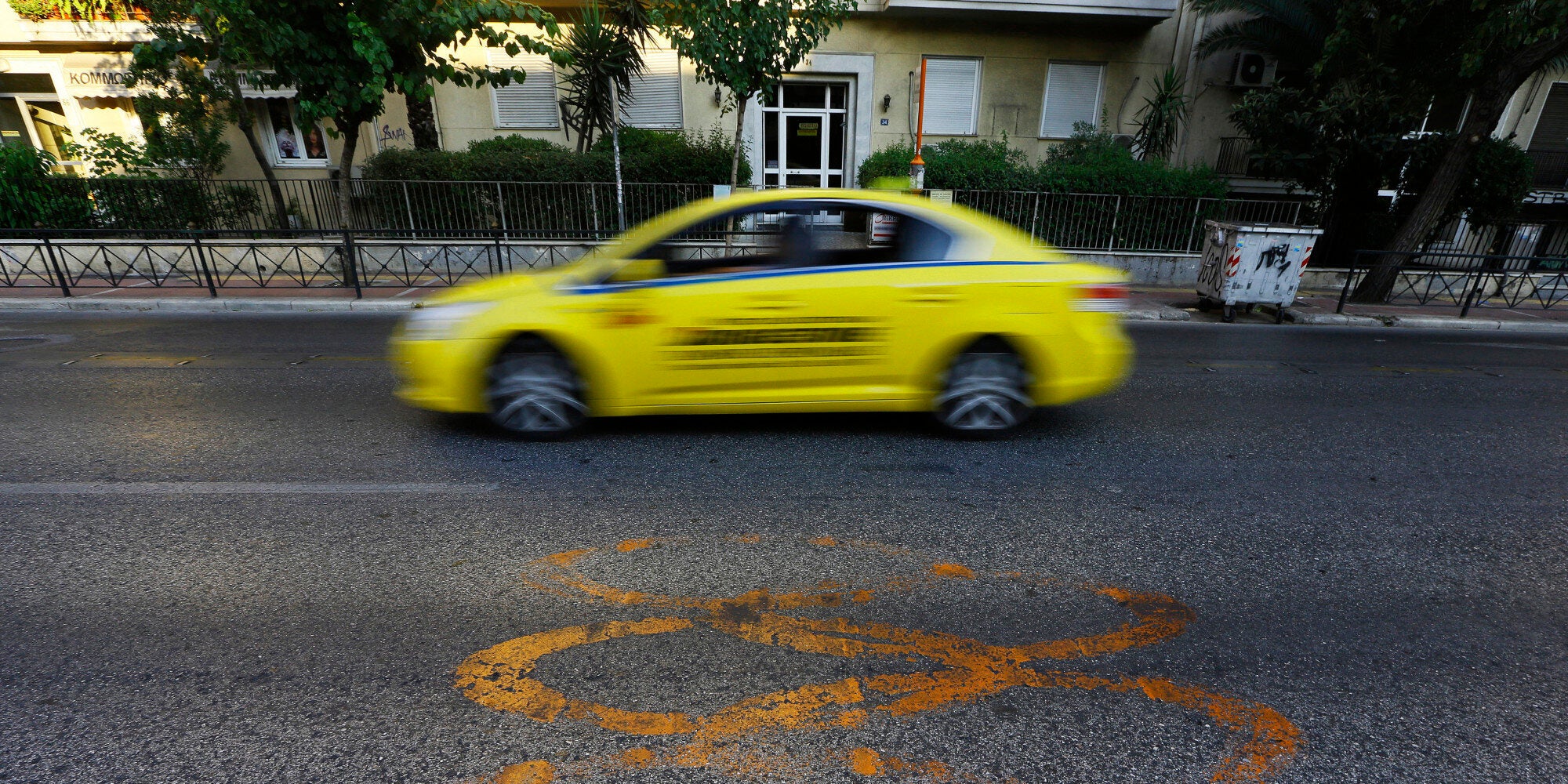 A taxi drives by fading Olympic rings which mark the Olympic Traffic Lane on an avenue leading to the Athens 2004 Olympic Complex in Athens July 26, 2014. Ten years after Greece hosted the world's greatest sporting extravaganza, many of its once-gleaming Olympic venues have been abandoned while others are used occasionally for non-sporting events such as conferences and weddings. For many Greeks who swelled with pride at the time, the Olympics are now a source of anger as the country struggles through a six-year depression, record unemployment, homelessness and poverty. Just days before the anniversary of the Aug. 13-29 Games in 2004, many question how Greece, among the smallest countries to ever host the Games, has benefited from the multi-billion dollar event. Picture taken July 26, 2014. REUTERS/Yannis Behrakis (GREECE - Tags: BUSINESS POLITICS SPORT TRANSPORT)ATTENTION EDITORS: PICTURE 25 OF 33 FOR WIDER IMAGE PACKAGE 'TEN YEARS ON - ATHENS' FADING OLYMPIC STADIUMS' TO FIND ALL IMAGES SEARCH 'BEHRAKIS KARAHALIS'