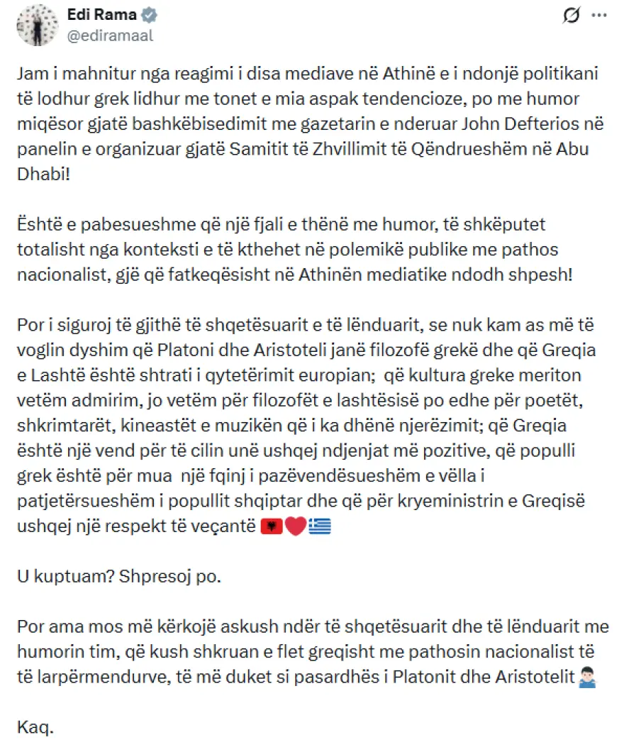 Ωστόσο, το κλείσιμο της ανάρτησής του επαναφέρει τον αιχμηρό τόνο που προκάλεσε αρχικά την κατακραυγή. Ο Έντι Ράμα σημειώνει με ειρωνική διάθεση ότι δυσκολεύεται να θεωρήσει απογόνους του Πλάτωνα και του Αριστοτέλη όσους «γράφουν και μιλούν ελληνικά με εθνικιστικό πάθος», αφήνοντας εκ νέου σαφείς αιχμές.
