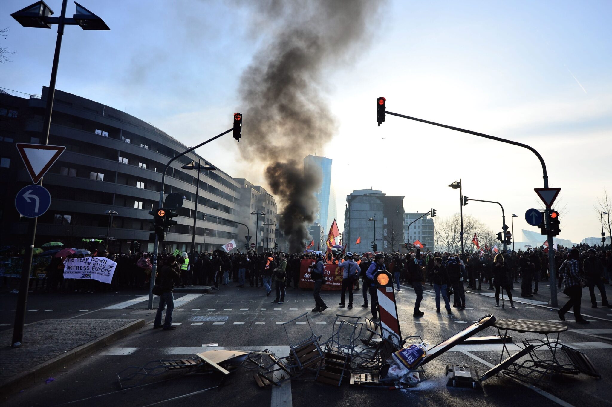 Μπροστά από το ύψους 185 μέτρων νέο κτίριο της ΕΚΤ υψωνόταν μαύρος καπνός από τις φωτιές που είχαν ανάψει οι διαδηλωτές όταν τα επεισόδια κορυφώθηκαν. Η αστυνομία χρησιμοποίησε εξάλλου εκτοξευτήρες νερού υπό πίεση για να προσπαθήσει να διαλύσει μια ομάδα μαυροντυμένων διαδηλωτών που έκαναν και τα επεισόδια. Περίπου 550 διαδηλωτές συνελήφθησαν.
