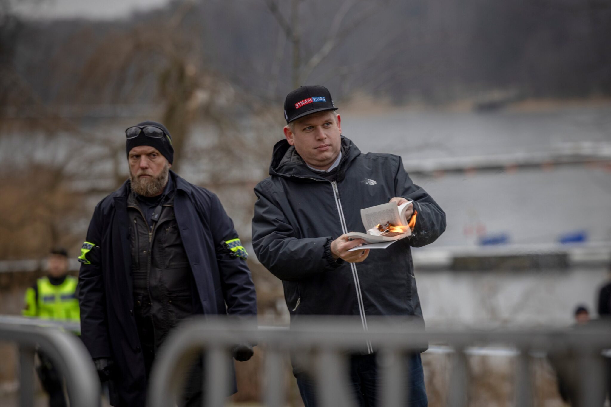ΣΤΟΚΧΟΛΜΗ, ΣΟΥΗΔΙΑ – 21 ΙΑΝΟΥΑΡΙΟΥ: Ο Rasmus Paludan καίει το Κοράνι έξω από την τουρκική πρεσβεία στις 21 Ιανουαρίου 2023 στη Στοκχόλμη της Σουηδίας. Οι σουηδικές αρχές έδωσαν άδεια σε μια σειρά διαδηλώσεων υπέρ και κατά της Τουρκίας εν μέσω της προσπάθειας να ενταχθεί h Σουηδία στο ΝΑΤΟ, με τον ακροδεξιό Δανό-Σουηδό πολιτικό Rasmus Paludan -μια αμφιλεγόμενη προσωπικότητα στη Σουηδία- να υψώνει ένα Κοράνι που καίγεται έξω από την τουρκική πρεσβεία. Την ίδια ώρα διαδήλωναν στον αντίποδα και ομάδες υπέρ του Ερντογάν, καθώς και φιλοκουρδικές ομάδες. (Photo by Jonas Gratzer/Getty Images)Jonas Gratzer via Getty Images