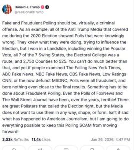 Σε ανάρτησή του στην πλατφόρμα Truth Social, ο Τραμπ υποστήριξε ότι οι δημοσκοπήσεις χρησιμοποιούνται ως συντονισμένη προσπάθεια χειραγώγησης της κοινής γνώμης.