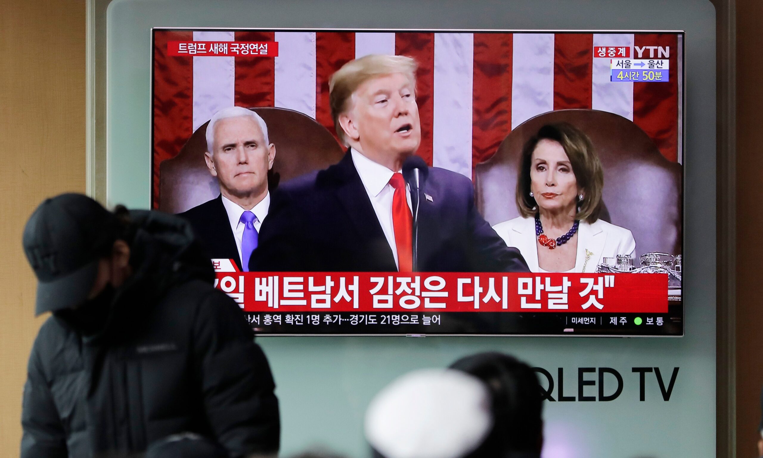 Η πρόεδρος της Βουλής των Αντιπροσώπων, μάλιστα, Νάνσι Πελόζι, καθόταν πίσω από τον Αμερικανό πρόεδρο φορώντας το λευκό κουστούμι της. Στη διάρκεια της ομιλίας του κουνούσε το κεφάλι της ή κοιτούσε με αποδοκιμασία τον Τραμπ όταν επέκρινε τους Δημοκρατικούς ή όταν περιέγραφε πώς οι παράτυποι μετανάστες επιτίθενται στις ΗΠΑ.
