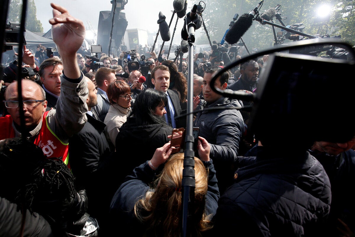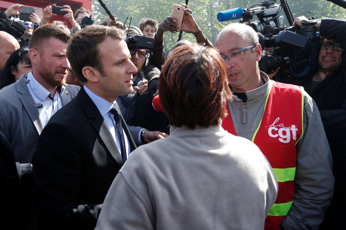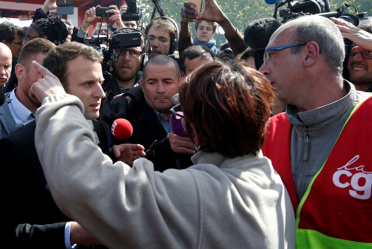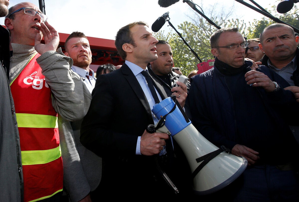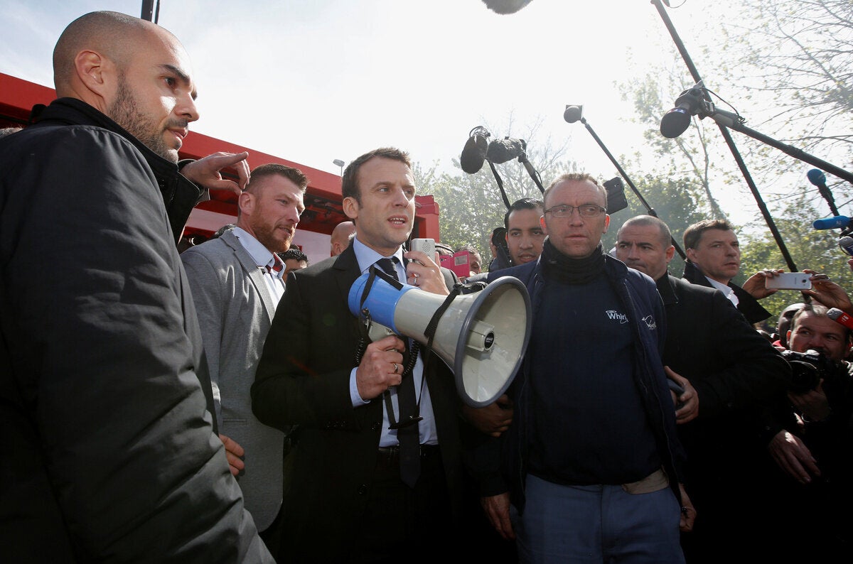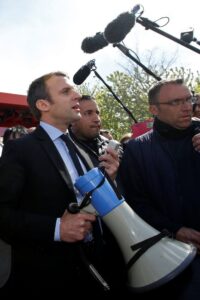 Το πλήθος φώναζε «Μαρίν, πρόεδρος» προς τον φιλοευρωπαϊστή υποψήφιο μπροστά από τη μονάδα της Whirlpool στην Αμιένη, στη βόρεια Γαλλία. Ο Μακρόν έφθασε εκεί το απόγευμα αφού η Μαρίν Λεπέν είχε επισκεφθεί αιφνιδιαστικά το εργοστάσιο το πρωί.