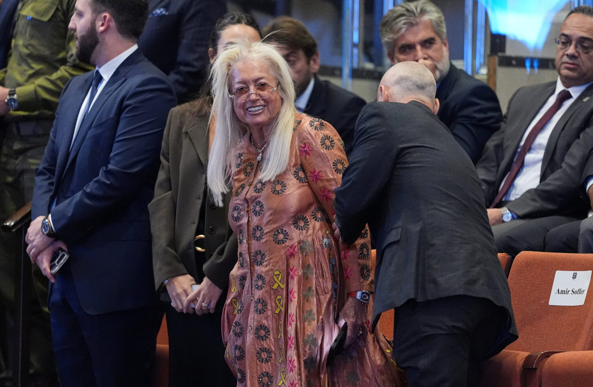 Ωστόσο, ανάμεσα στους θεατές στο θεωρείο της ολομέλειας ξεχώρισε μία ιδιαίτερη παρουσία: η Ισραηλινοαμερικανίδα δισεκατομμυριούχος Μίριαμ Άντελσον. Με ένα μεταξωτό φόρεμα στο χρώμα του χαλκού και την χαρακτηριστική κίτρινη κορδέλα – σύμβολο αλληλεγγύης προς τους ομήρους που απήχθησαν από τη Χαμάς – η 80χρονη καθόταν πίσω από την Ιβάνκα Τραμπ, συνοδευόμενη από τον γιο της Ματάν Άντελσον και τον βουλευτή του Λικούντ, Μπόαζ Μπισμούτ, πρώην διευθυντή της εφημερίδας Israel Hayom, που ανήκει στην οικογένεια Άντελσον.
