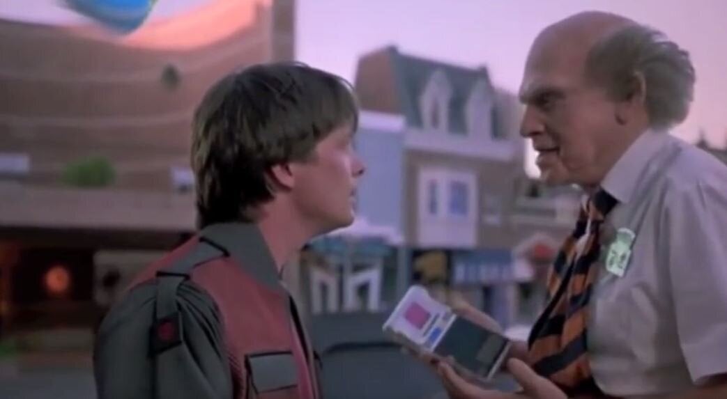 4. Τηλεδιάσκεψη. Βλέπουμε στην ταινία τον ενήλικα Marty McFly ( ο χαρακτήρας που υποδυόταν ο Μάικλ Τζέι Φόξ) να συνομιλεί μέσω μιας οθόνης, video chat, με τον εργοδότη του. Θυμίζει και Skype.