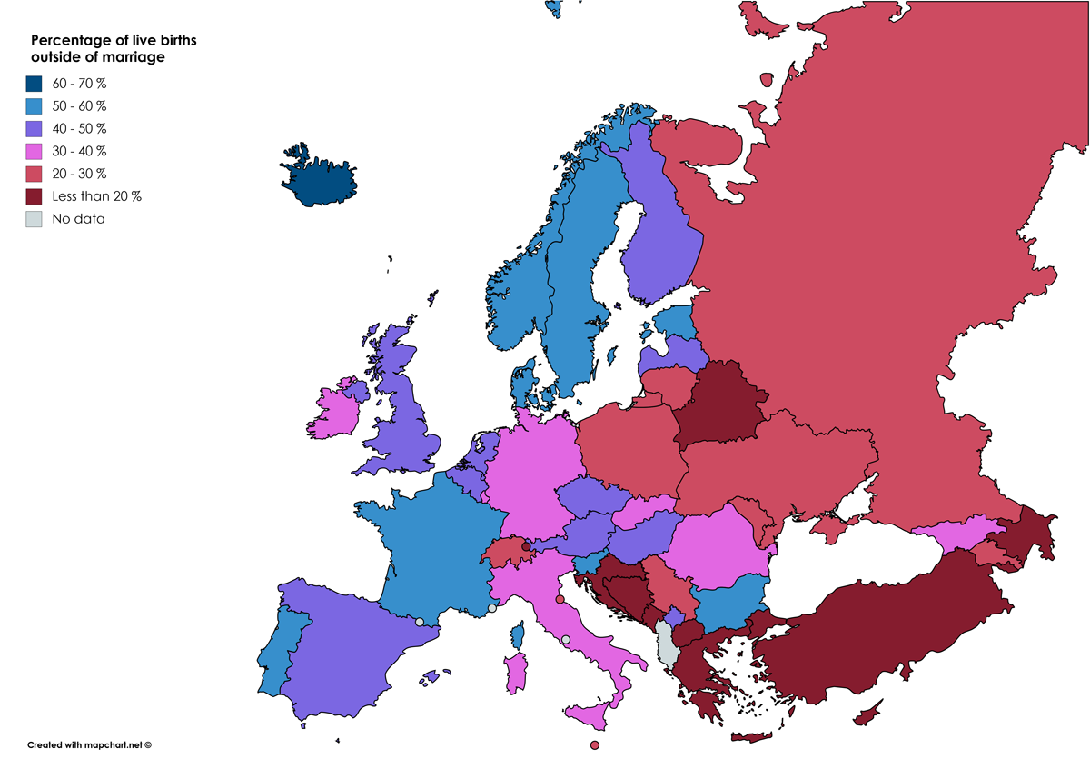 Ποιες όμως είναι οι ευρωπαϊκές χώρες στις οποίες τα περισσότερα μωρά γεννιούνται εκτός γάμου; Ένας χρήστης του reddit με αφορμή το εν λόγω ερώτημα δημιούργησε ένα χάρτη με τις ευρωπαϊκές χώρες στις οποίες καταγράφονται γεννήσεις μωρών χωρίς να έχει προηγηθεί γάμος.