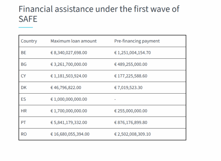 Η Βουλγαρία δικαιούται 3,26 δισεκατομμύρια ευρώ, η Κροατία 1,7 δισεκατομμύρια, η Κύπρος έως 1,18 δισεκατομμύρια ευρώ με άμεση προκαταβολή 177,2 εκατομμύρια, η Ισπανία 1 δισεκατομμύριο χωρίς προκαταβολή σε αυτή τη φάση και η Δανία 46,8 εκατομμύρια ευρώ.
