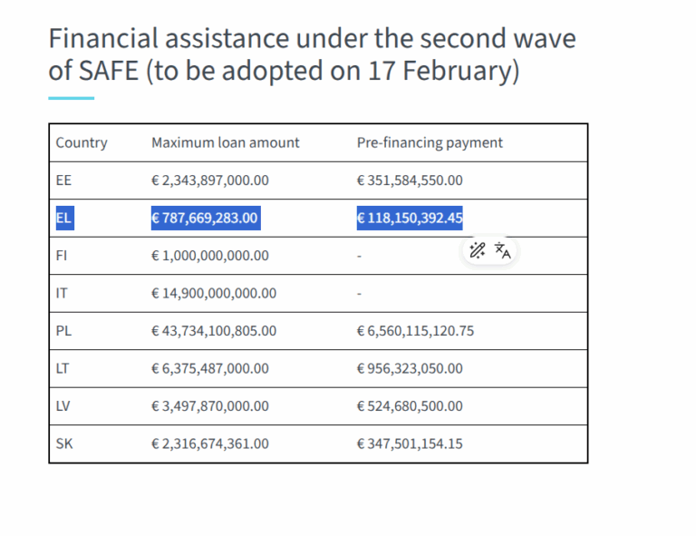 Το ποσό αυτό αποτελεί το μέγιστο ύψος δανεισμού που μπορεί να αξιοποιήσει η Ελλάδα μέσω του SAFE για κοινές ευρωπαϊκές προμήθειες και επενδύσεις στην αμυντική βιομηχανία. Δεν πρόκειται για επιχορήγηση αλλά για μακροπρόθεσμο δάνειο με ευνοϊκούς όρους, το οποίο θα εκταμιεύεται σταδιακά ανάλογα με την πρόοδο των επενδύσεων.