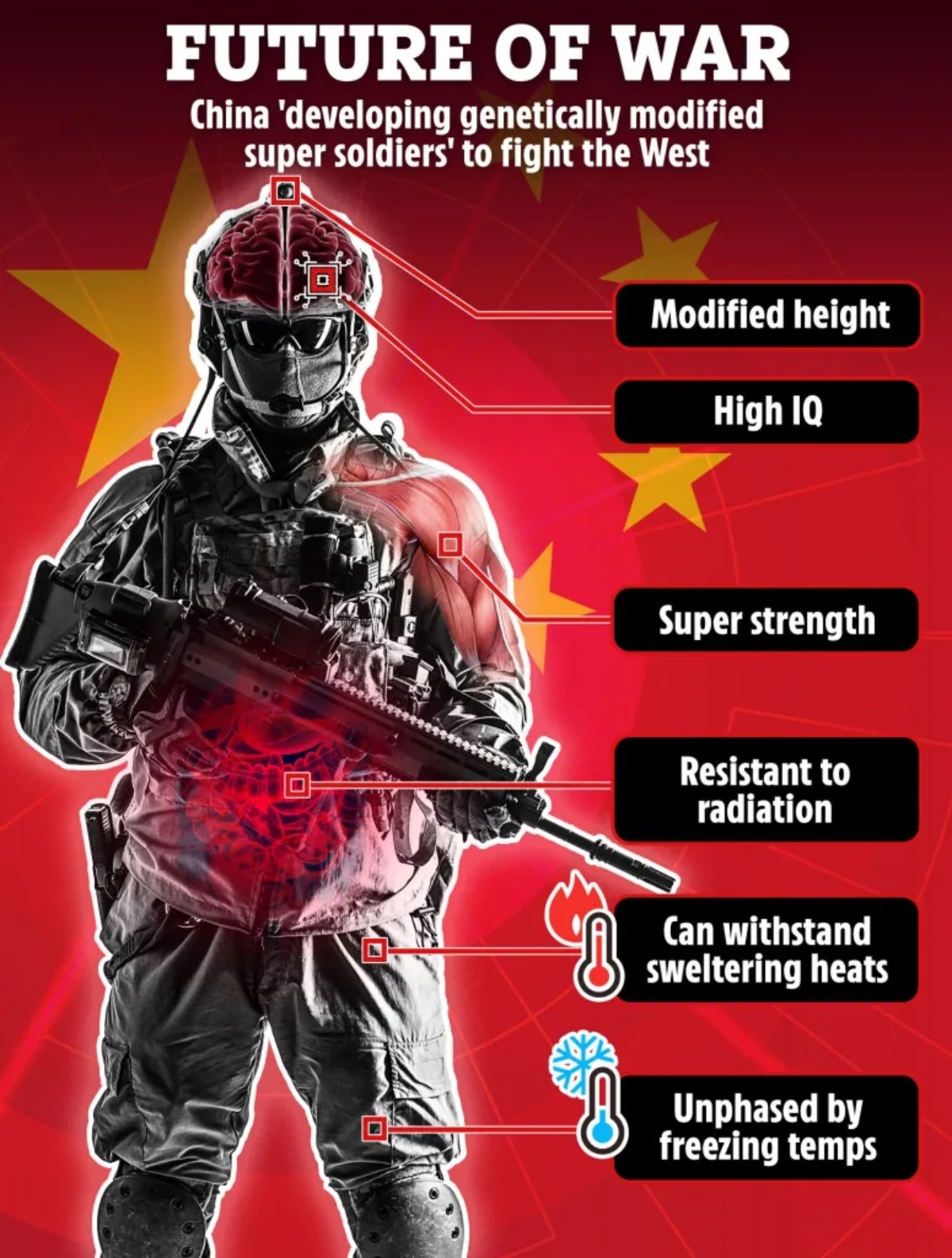 Όπως επισημαίνεται, τα στρατεύματα του Σι Τζινπίνγκ θα μπορούσαν στο άμεσο μέλλον να υποστούν γενετική τροποποίηση ώστε να αντέχουν σε ακραίες θερμοκρασίες, να διαθέτουν αυξημένη σωματική δύναμη και πνευματική ικανότητα, αλλά και να εμφανίζουν αντοχή σε επικίνδυνα επίπεδα ακτινοβολίας. Παρότι η Κίνα διαθέτει ήδη τον μεγαλύτερο στρατό παγκοσμίως, κατηγορείται ότι επιδιώκει τη δημιουργία μιας «ανώτερης» κατηγορίας στρατιωτών, σχεδιασμένων σε μυστικά εργαστήρια σε ολόκληρη τη χώρα.