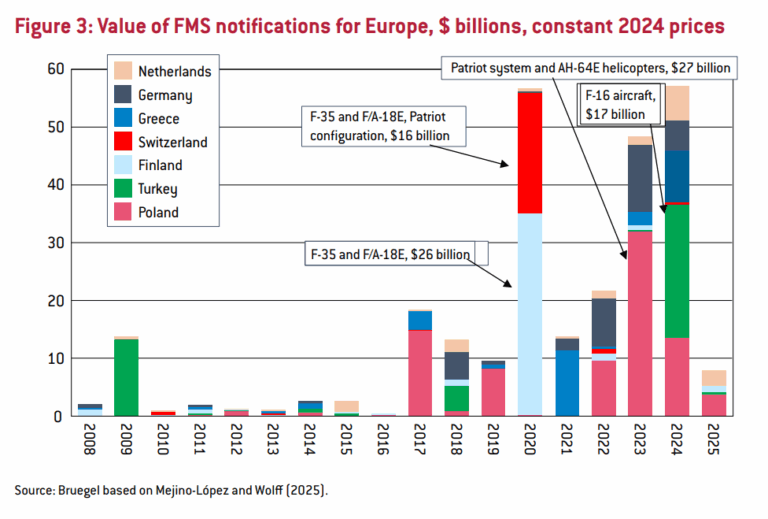 Η έκθεση καταγράφει ότι, από το 2022 έως το 2024, οι ευρωπαϊκές χώρες αγόρασαν μέσω FMS περισσότερο από το 50% του συνολικού εξοπλισμού τους, ποσοστό σχεδόν διπλάσιο από την προηγούμενη τριετία. Η αύξηση αποδίδεται στις ανάγκες ανασυγκρότησης των στρατών μετά την εισβολή της Ρωσίας στην Ουκρανία, αλλά και στη δυσκολία των ευρωπαϊκών βιομηχανιών να ανταποκριθούν στην αιφνίδια έκρηξη ζήτησης.