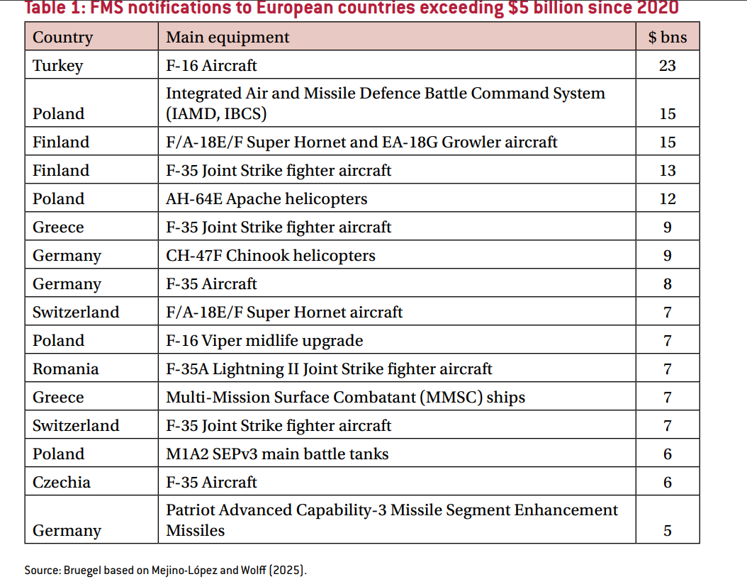 Όπως αναφέρουν οι συντάκτες της έρευνας, Χουάν Μεχίνο-Λόπεθ και Γκούντραμ Βολφ, οι οποίοι ανέλυσαν 1.179 ειδοποιήσεις στο πλαίσιο του προγράμματος Foreign Military Sales (FMS – Πρόγραμμα Ξένων Στρατιωτικών Πωλήσεων) των ΗΠΑ από το 2008, την τελευταία τετραετία η Ευρώπη έχει αυξήσει σημαντικά τις αγορές της από τη βιομηχανική βάση άμυνας των ΗΠΑ, εμβαθύνοντας έτσι την εξάρτησή της από τον αμερικανικό στρατιωτικό εξοπλισμό βραχυπρόθεσμα και μεσοπρόθεσμα.