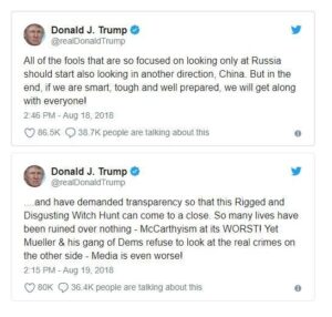 Όσοι παρακολουθούν τα tweets του Αμερικανού προέδρου, θα θυμούνται ότι στις 19 Αυγούστου είχε κατηγορήσει ξανά τους Κινέζους για ανάμειξη στις αμερικάνικες εκλογές. «Όλοι αυτοί οι ηλίθιοι που επικεντρώνονται στη Ρωσία θα πρέπει να αρχίσουν να κοιτάνε προς μια άλλη κατεύθυνση, την Κίνα», έγραψε ο Αμερικανός πρόεδρος για να τον επιβεβαιώσει στη συνέχεια ο σύμβουλος εθνικής ασφαλείας του Λευκού Οίκου, Τζον Μπόλτον. «Μπορώ μετά βεβαιότητας να σας πω ότι πρόκειται για μια απειλή για την εθνική ασφάλεια των ΗΠΑ», τόνισε ο αποκαλούμενος και «Γεράκι» της Αμερικανικής εξωτερικής πολιτικής, Μπόλτον. Όταν όμως του ζητήθηκαν λεπτομέρειες για τον τρόπο που προσπαθεί η Κίνα να επηρεάσει τις αμερικάνικες εκλογές, ο Μπόλτον παρέμεινε ασαφής. «Δεν μπορώ να υπεισέλθω σε λεπτομέρειες σχετικά με όσα έχω δει ή όχι.»